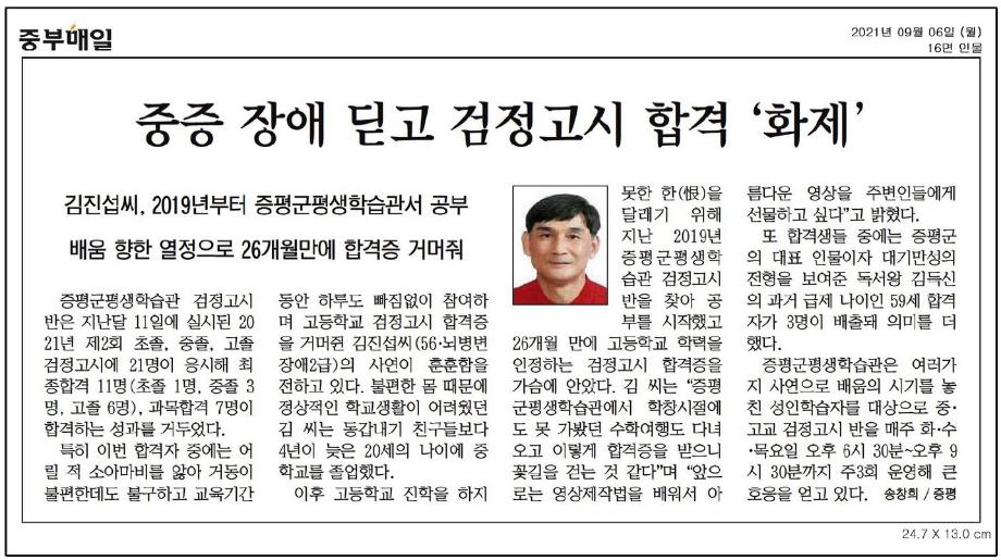 증평군평생학습관 검정고시반 합격11명, 과목합격7명 합격