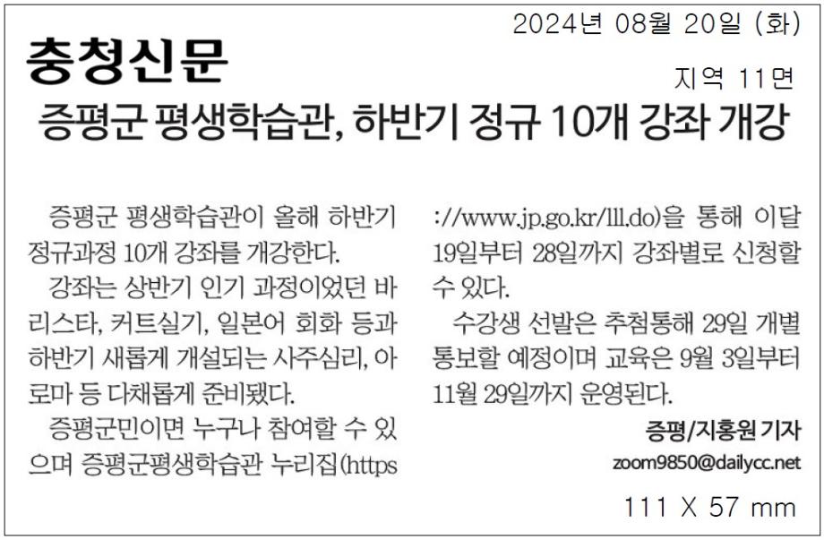 증평군평생학습관 하반기 정규과정 개강