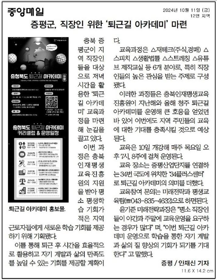증평군 직장인을 위한 퇴근길 아카데미 마련