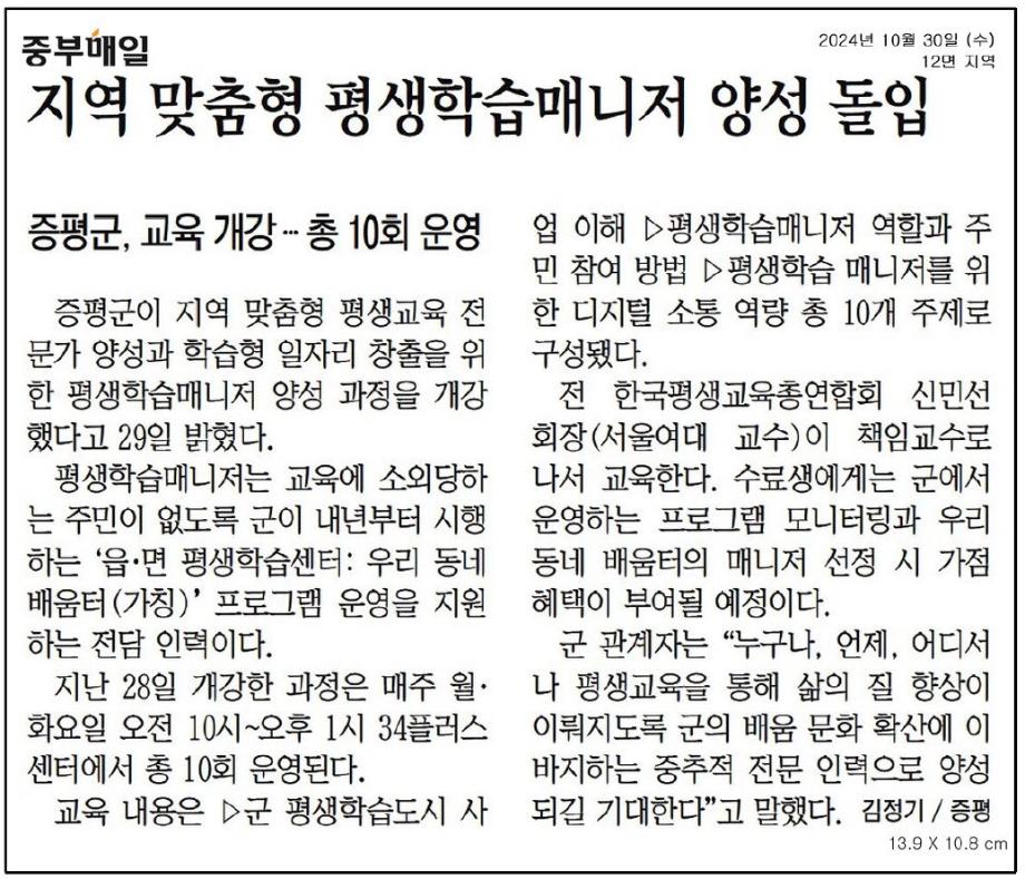 증평군, 촘촘한 학습망 구축을 위해 주민들이 나선다