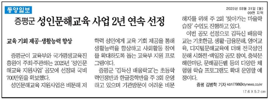 성인문해교육 사업2년 연속 선정