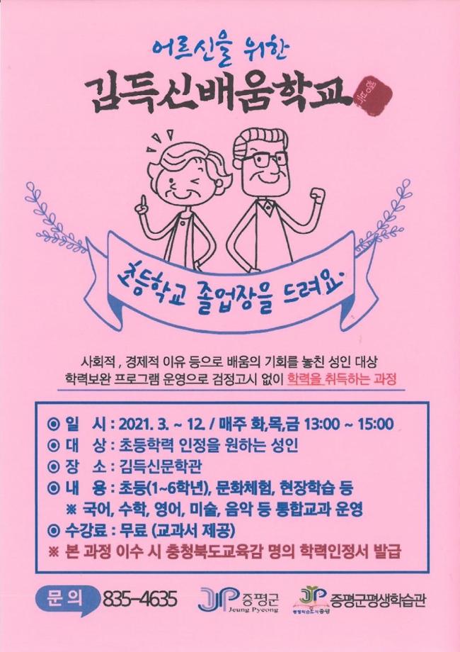 김득신 배움학교는 2014년 증평군립도서관 개관과 함께 비학력 과정 문해교육을 시작했습니다.