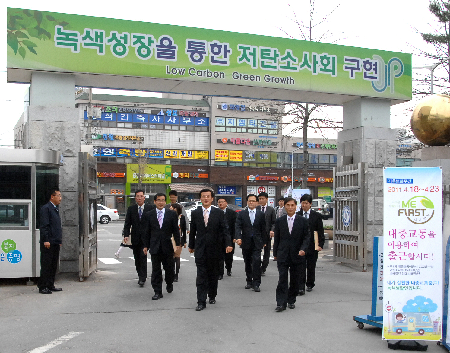 홍성열 증평군수를 비롯한 증평군 공직자들은 제41회 지구의 날(4.22)과 기후변화 주간(4.18~4.23일)을 맞아 자전거 및 도보로 출근하기 운동과 대중교통 이용 운동을 전개하고 있다.[증평포커스 참조 : 사진은 홍성열 증평군수와 증평군 공직자들이 도보로 출근하는 모습]