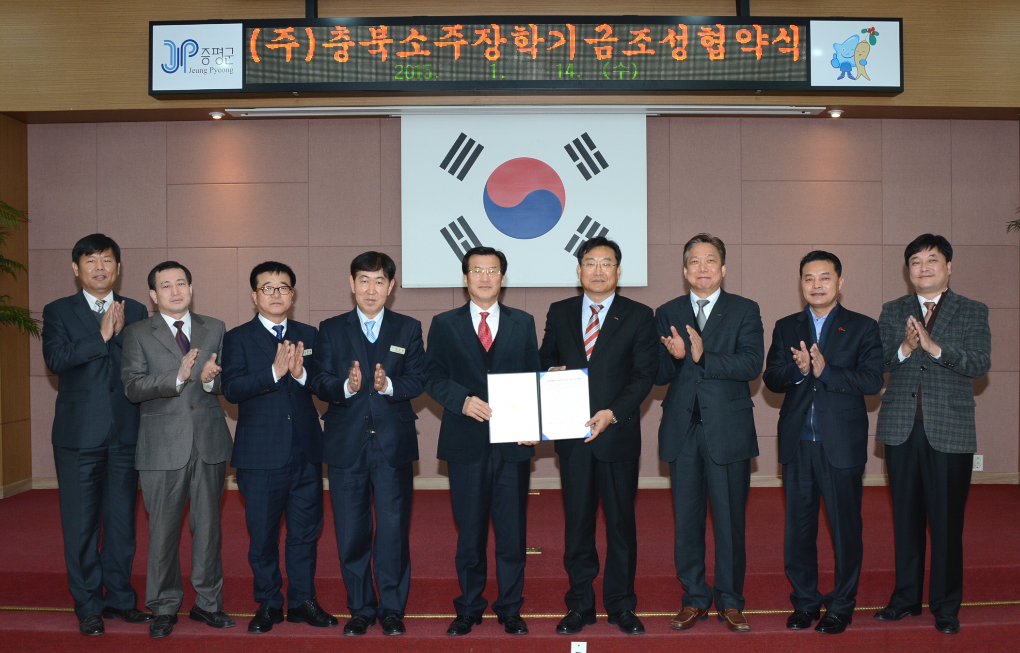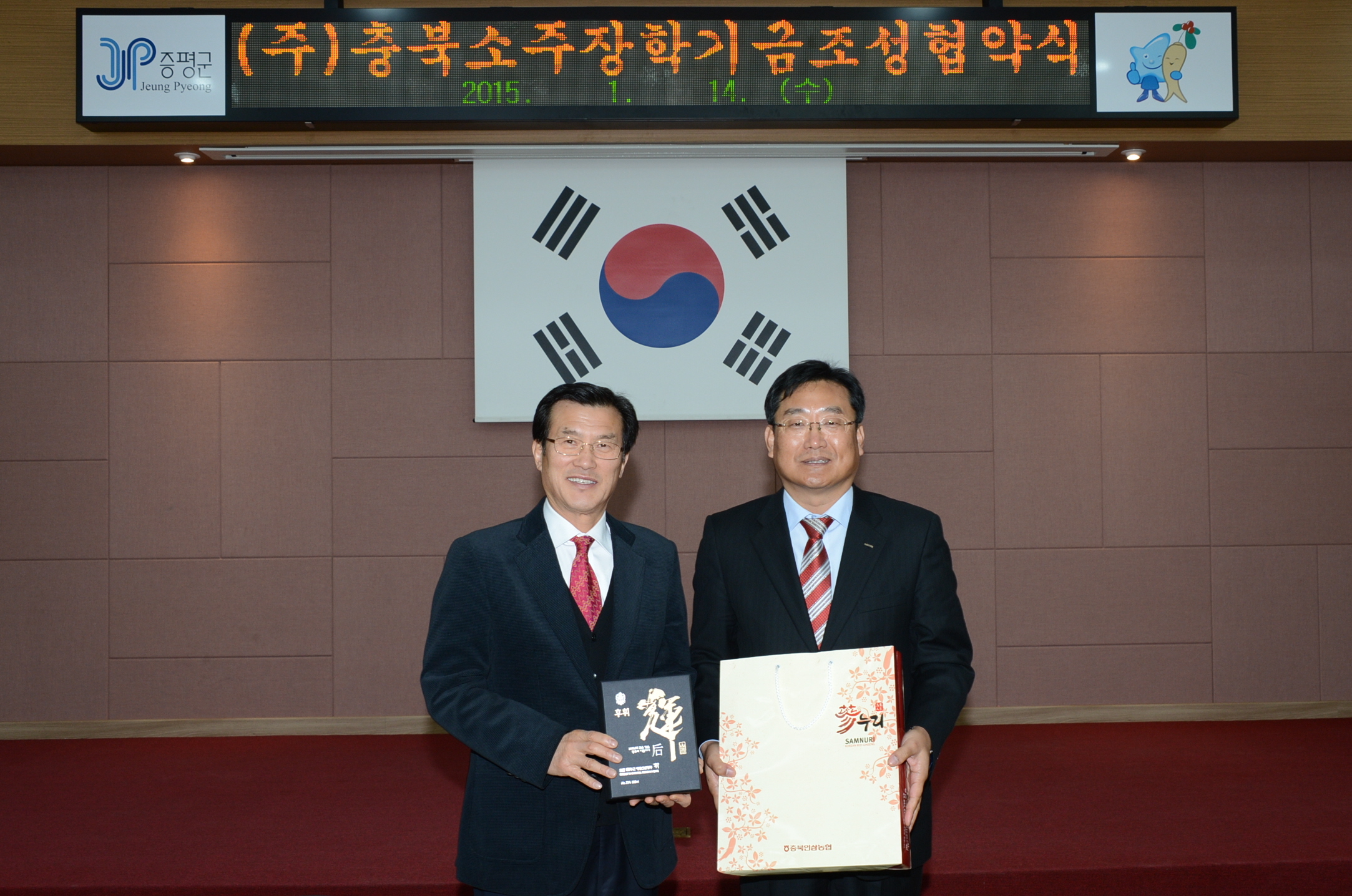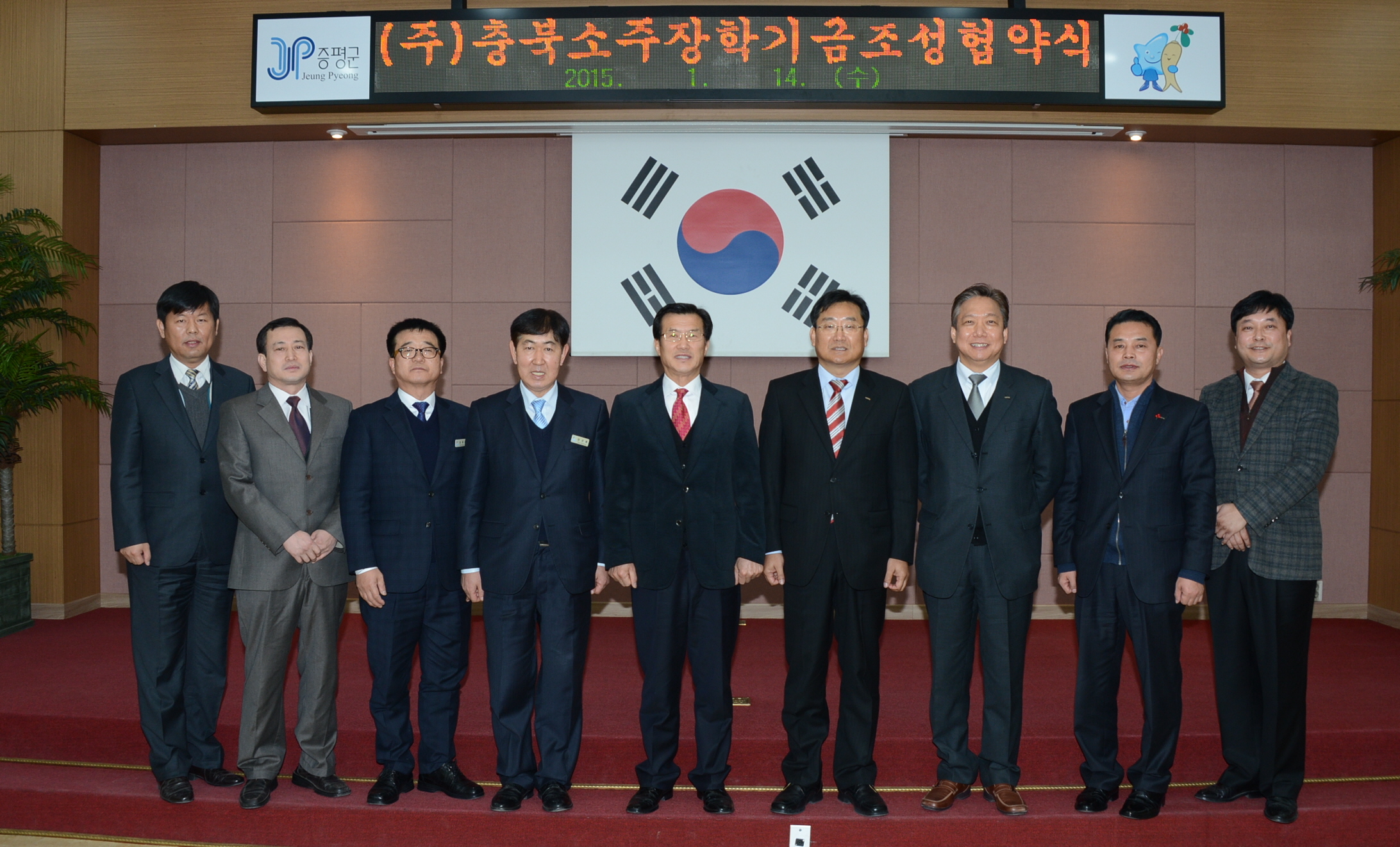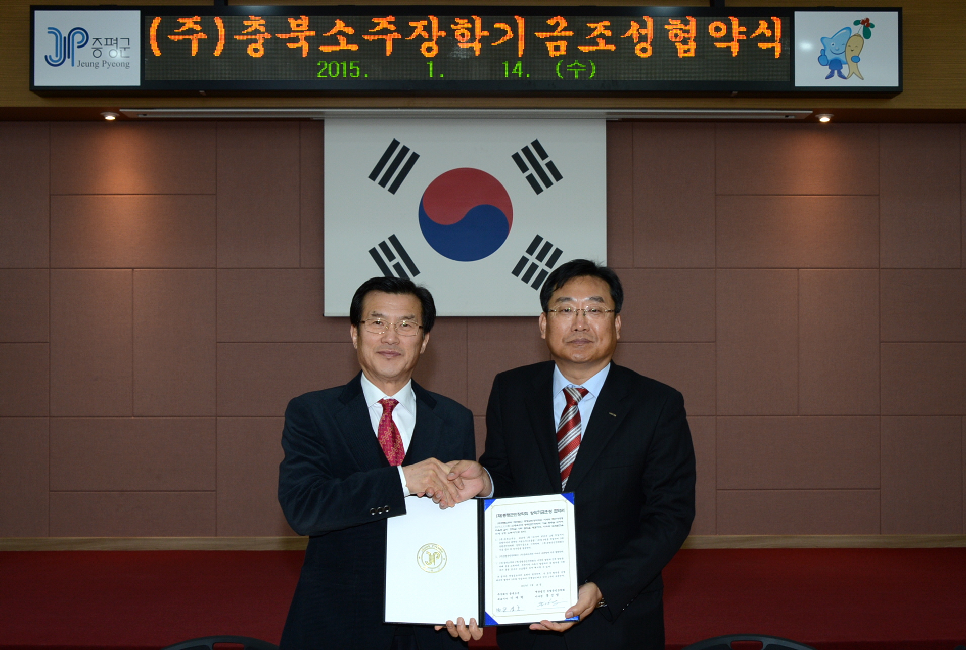 (주)충북소주(대표이사 이재혁)는 14일 오전 증평군청 대회의실에서 (재)증평군민장학회(이사장 홍성열 증평군수)와 장학사업을 위한 장학기금 조성 협약을 체결했다. [보도자료실 참조]