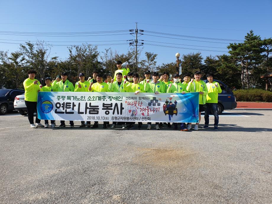 증평에 거주하는 20대 청년 53명으로 구성된 청년단체인 선진회(회장 엄재헌)가 13일 증평군에 거주하는 생활이 어려운 이웃 3가구에 연탄 777장(53만원 상당)을 전달했다.