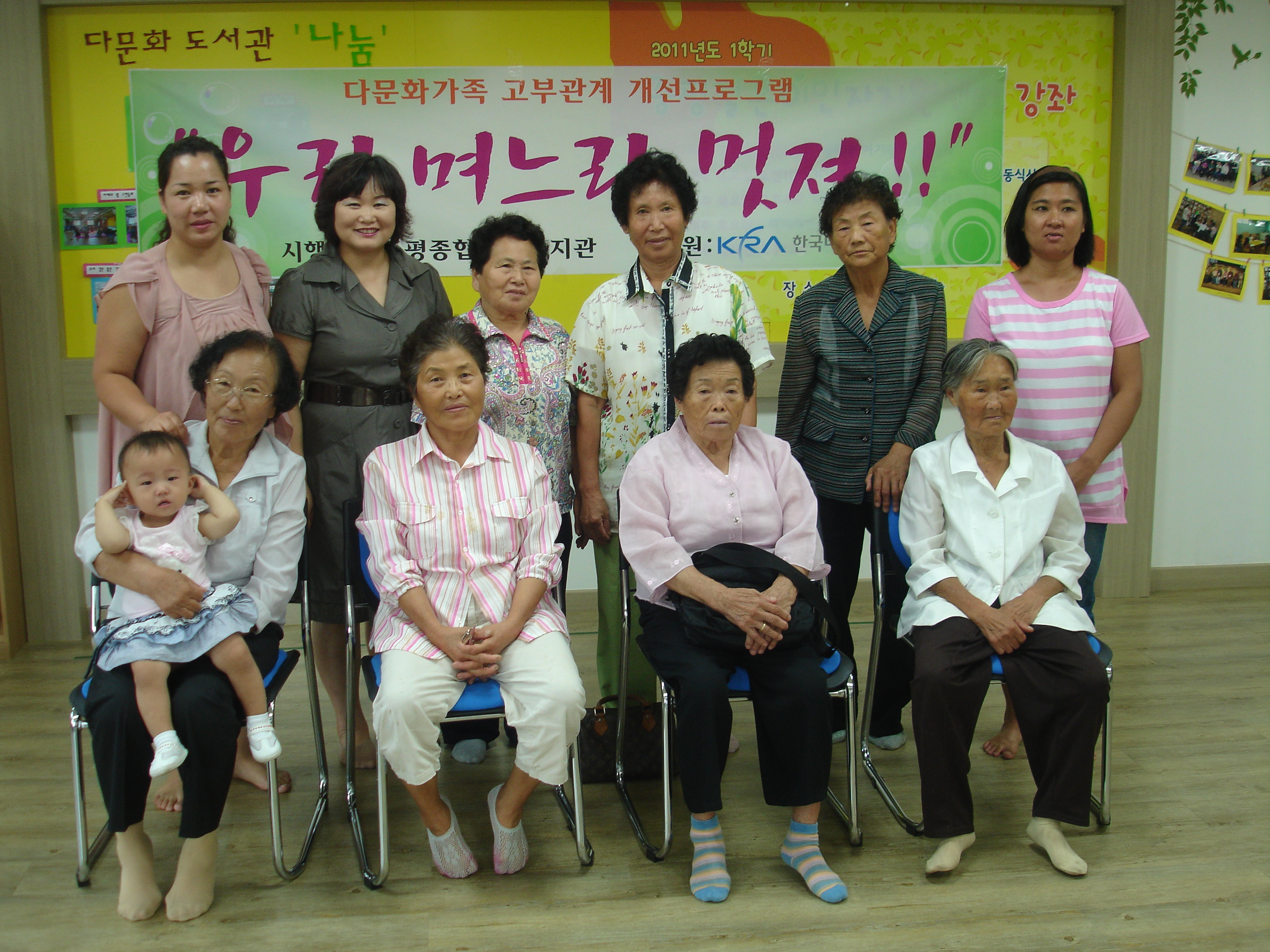 증평종합사회복지관(관장 양천공)은 21일 증평다문화 도서관에서 지역 내 결혼 이주 여성과 한국인 시어머니 사이에 세대 및 문화 차이 극복을 통해 고부관계를 개선하는 ‘우리 며느리 멋져’ 프로그램 발대식을 가졌다. [보도자료실 참조]