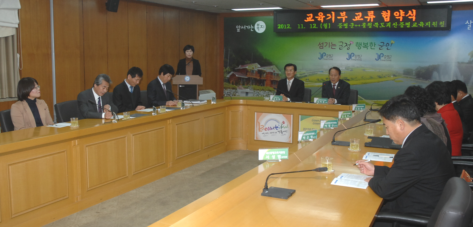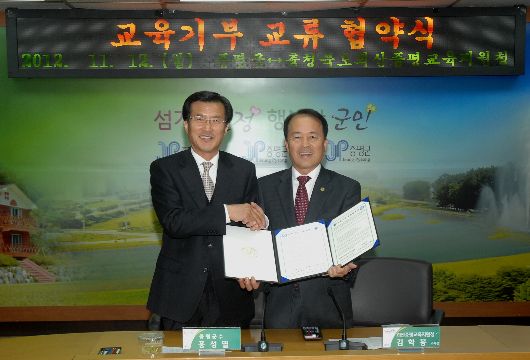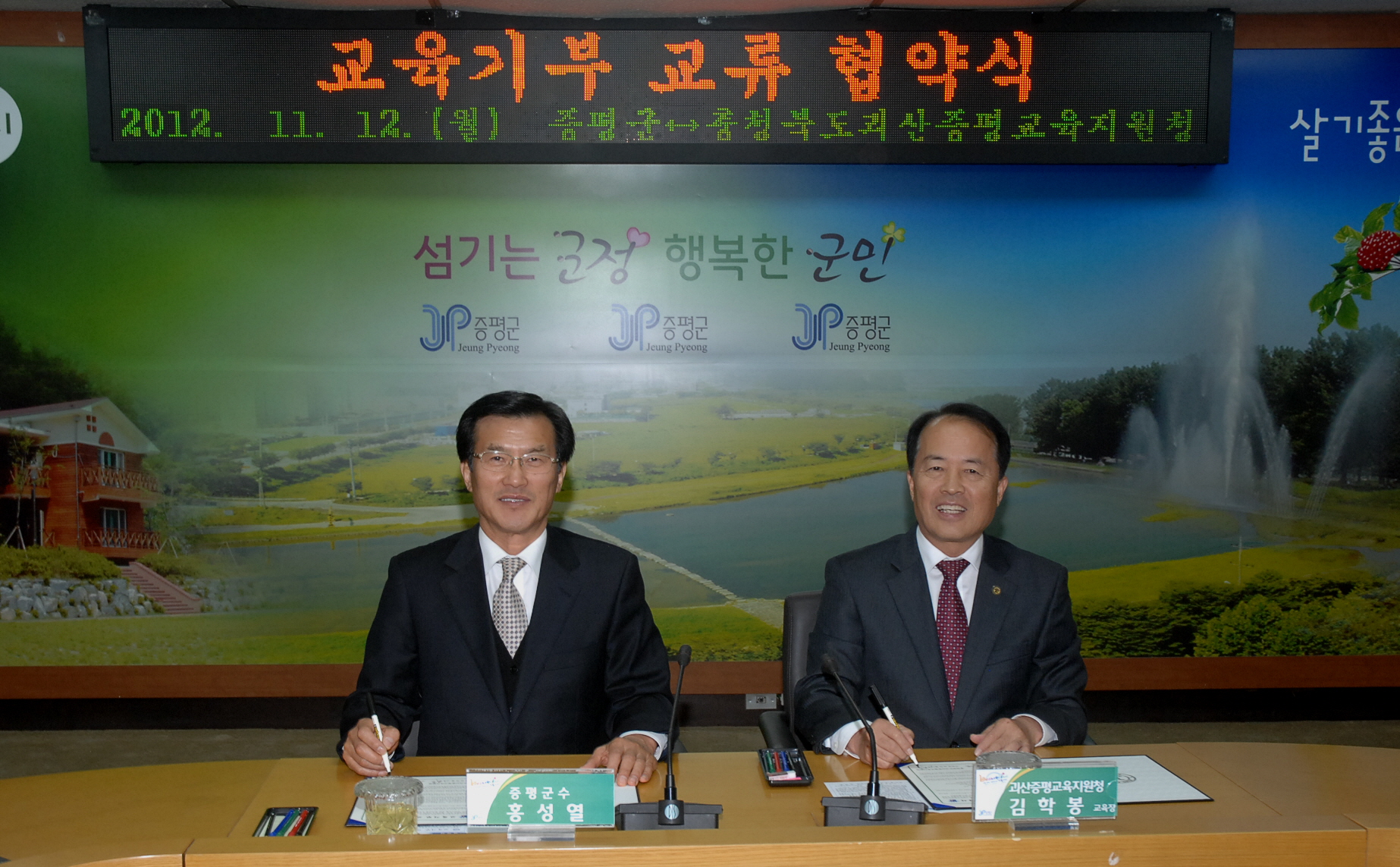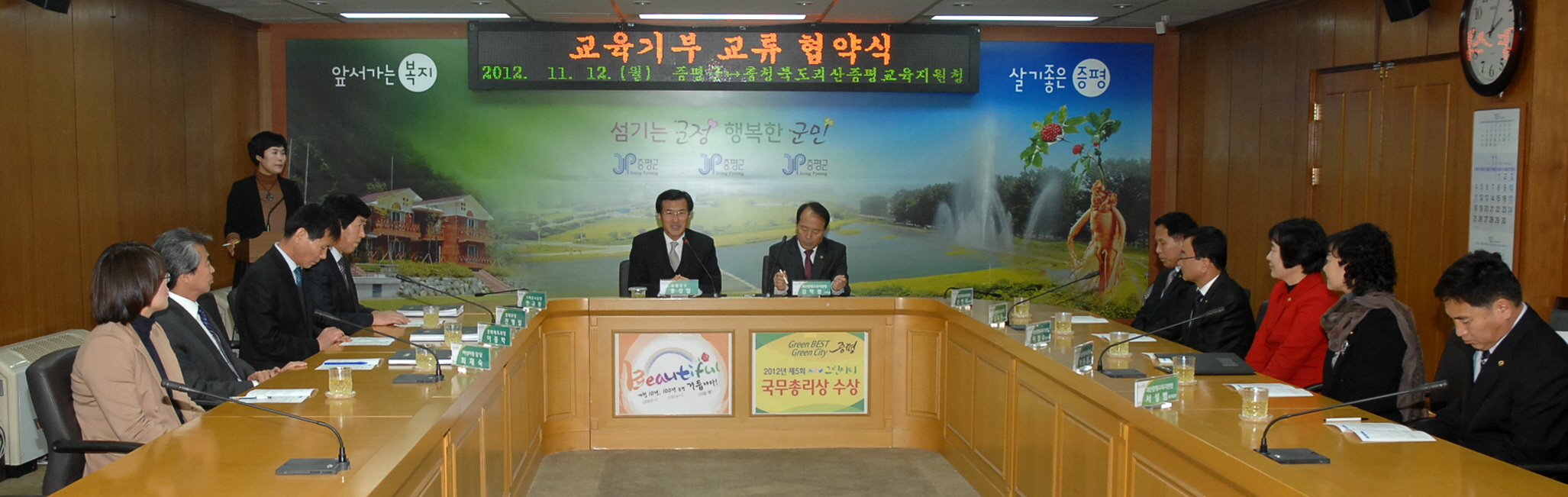 증평군과 괴산증평교육지원청은 12일 오후 2시 군청 소회의실에서 주 5일제 수업이 보다 안정적으로 정착될 수 있도록 토요프로그램을 활성화하기 위한 교육기부 교류협약을 체결했다. [보도자료실 참조]