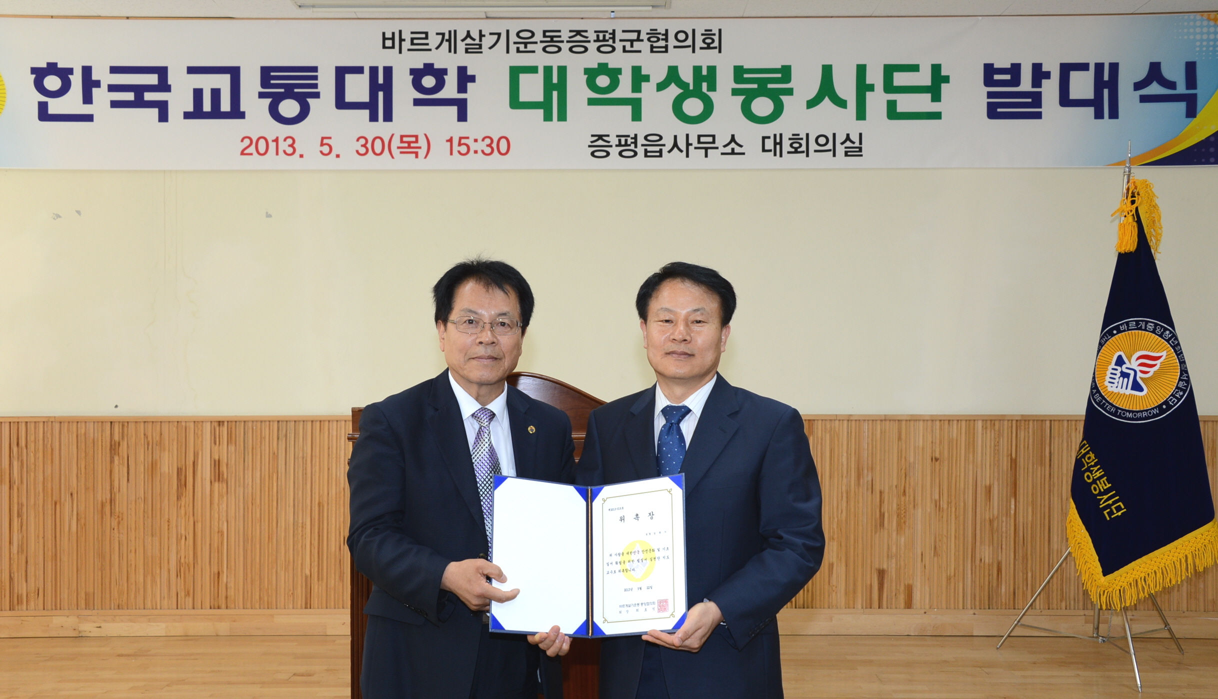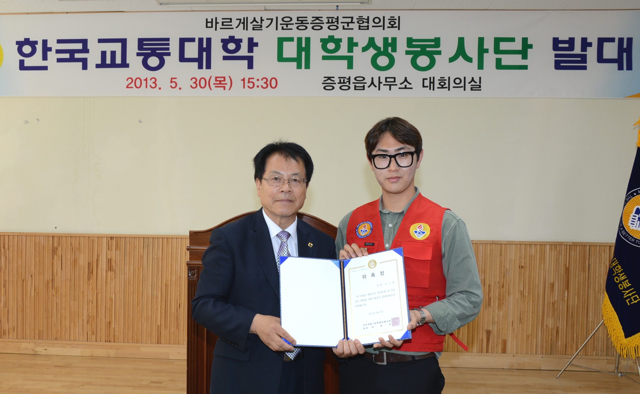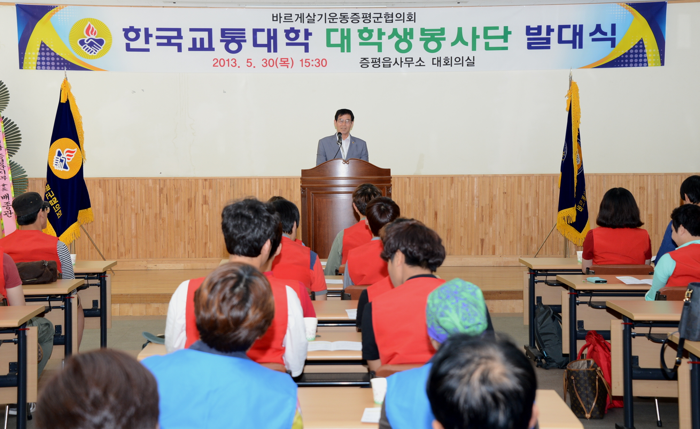 바르게살기운동증평군협의회(회장 이상욱)는 30일 오후 3시30분 증평읍사무소 회의실에서 한국교통대학교 증평캠퍼스 재학생 40명으로 구성된 ‘바르게살기 한국교통대학교 증평군 대학생봉사단’ 발대식을 개최했다. [보도자료실 참조]