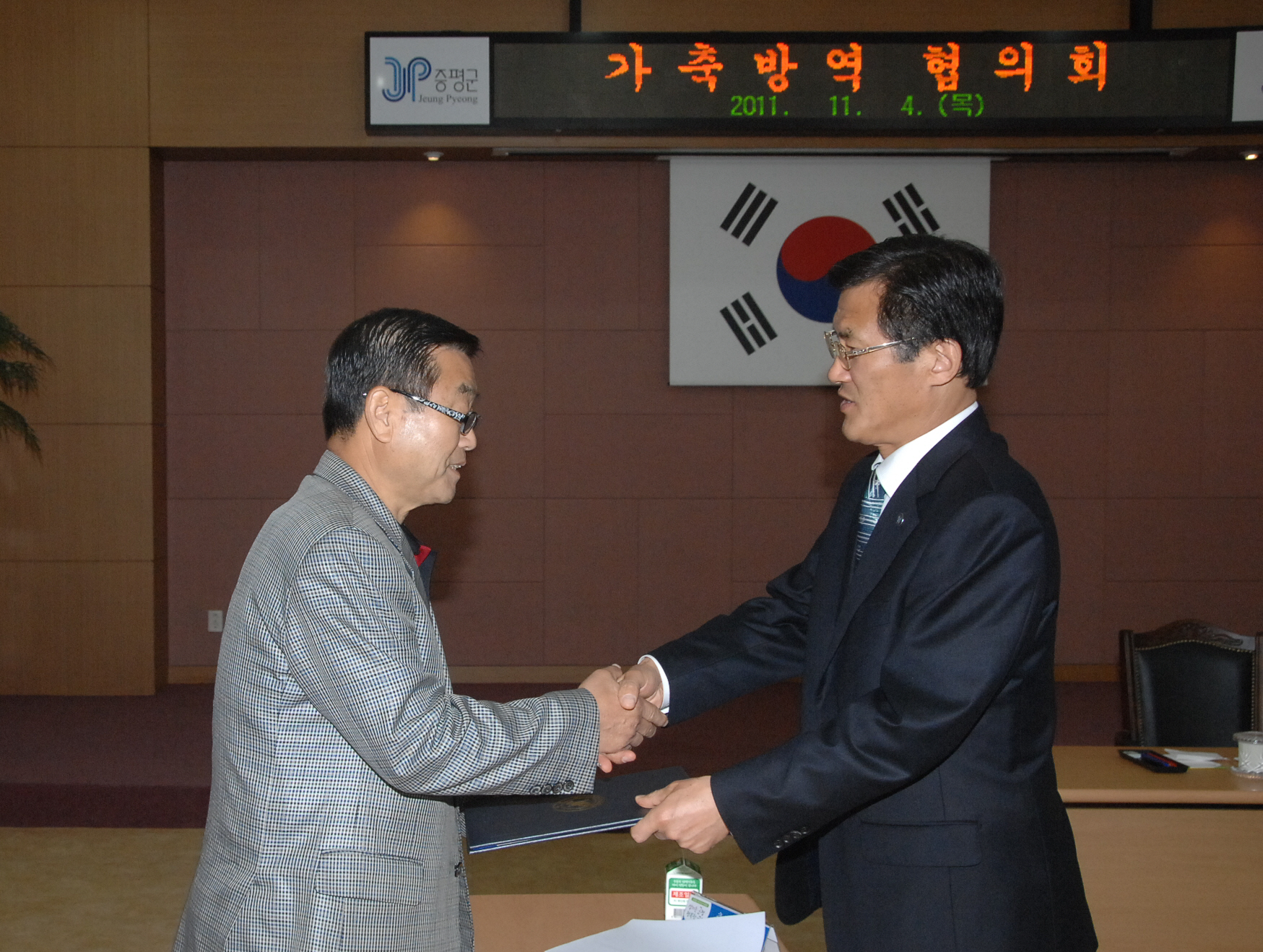 증평군은 4일 오전 11시 군청 대회의실에서 축종별 축산단체 대표 및 관계자 15명이 참석한 가운데 구제역 재발방지를 위한 방역협의회를 개최하는 한편 가축질병예찰 감시단에 축종별 대표 6명을 감시원으로 추가 위촉해 위촉장 전달했다. [보도자료실 참조]