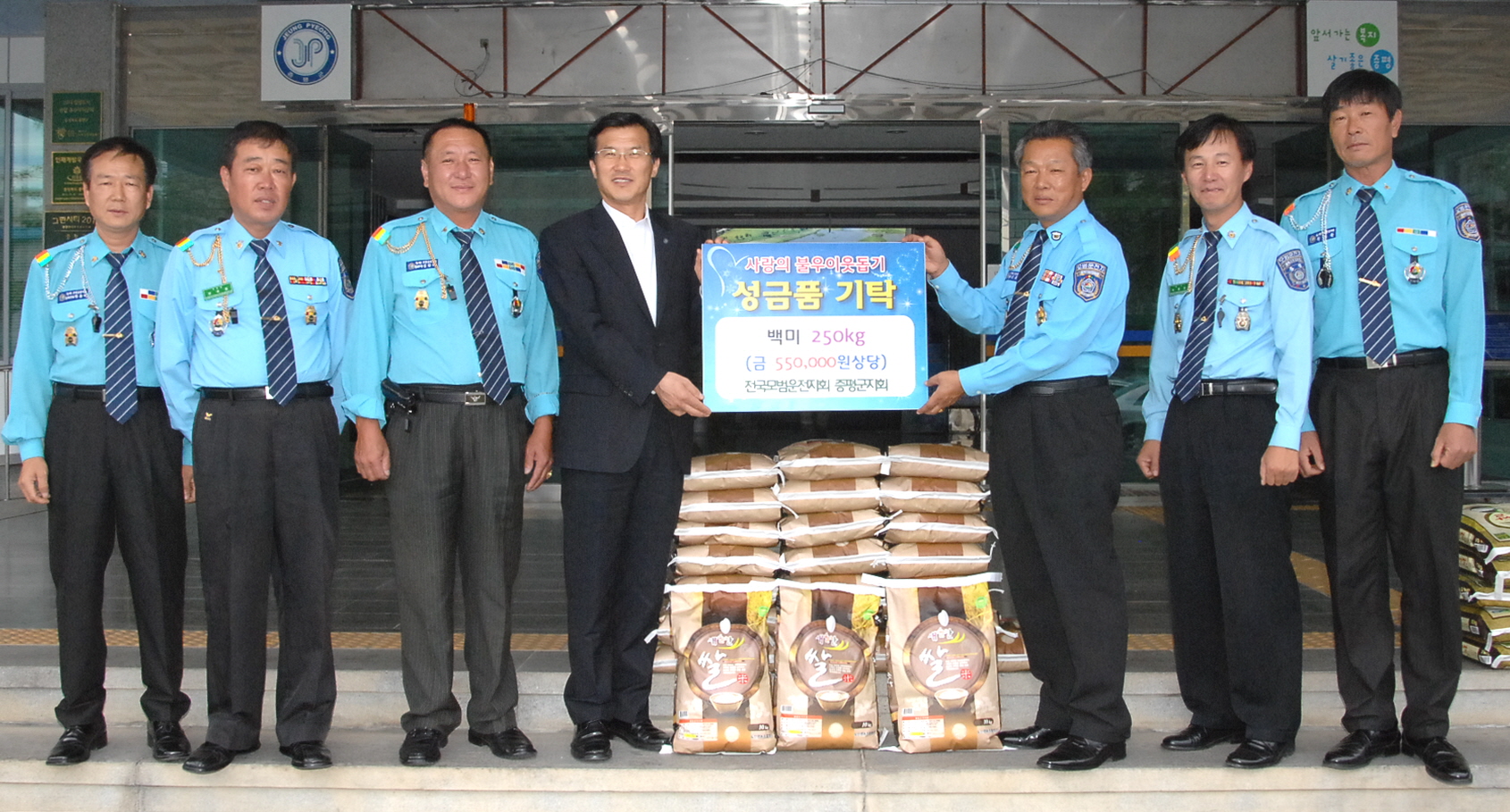 증평군 모범운전자회(회장. 진익상)는 한가위를 앞두고 26일 오후3시 지역 내 어려운 이웃에 전달해 달라며 백미 250㎏(55만원상당)을 증평군에 기탁했다. [보도자료실 참조]