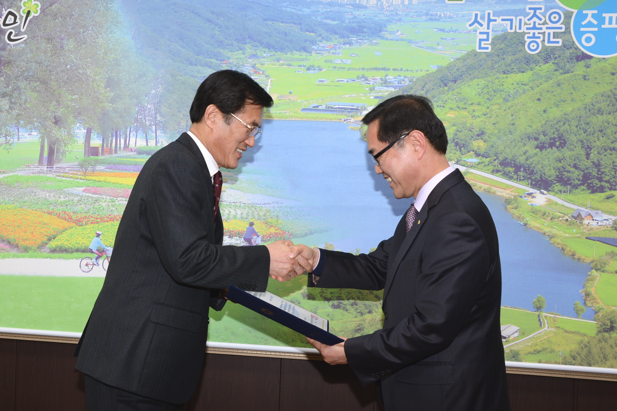증평군은 전국 229개 지방자치단체를 대상으로 평가한 2013년 한국지방자치경쟁력지수(KLCI) 조사에서 ‘종합경쟁력 상승’부문과 ‘경영자원 경쟁력 상승’ 부문에서 각각 전국 1위와 2위에 올라, 7일 군수 집무실에서 한국공공자치연구원 이기헌 대표로부터 인증서를 수여받았다. [증평보도자료실 참조]