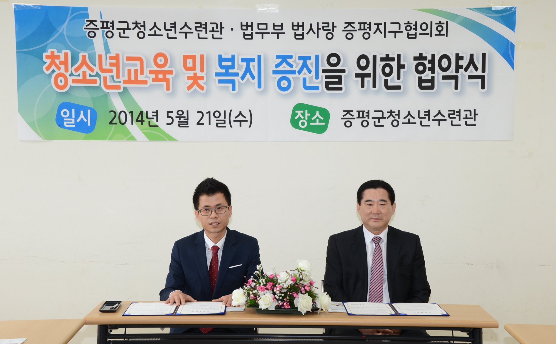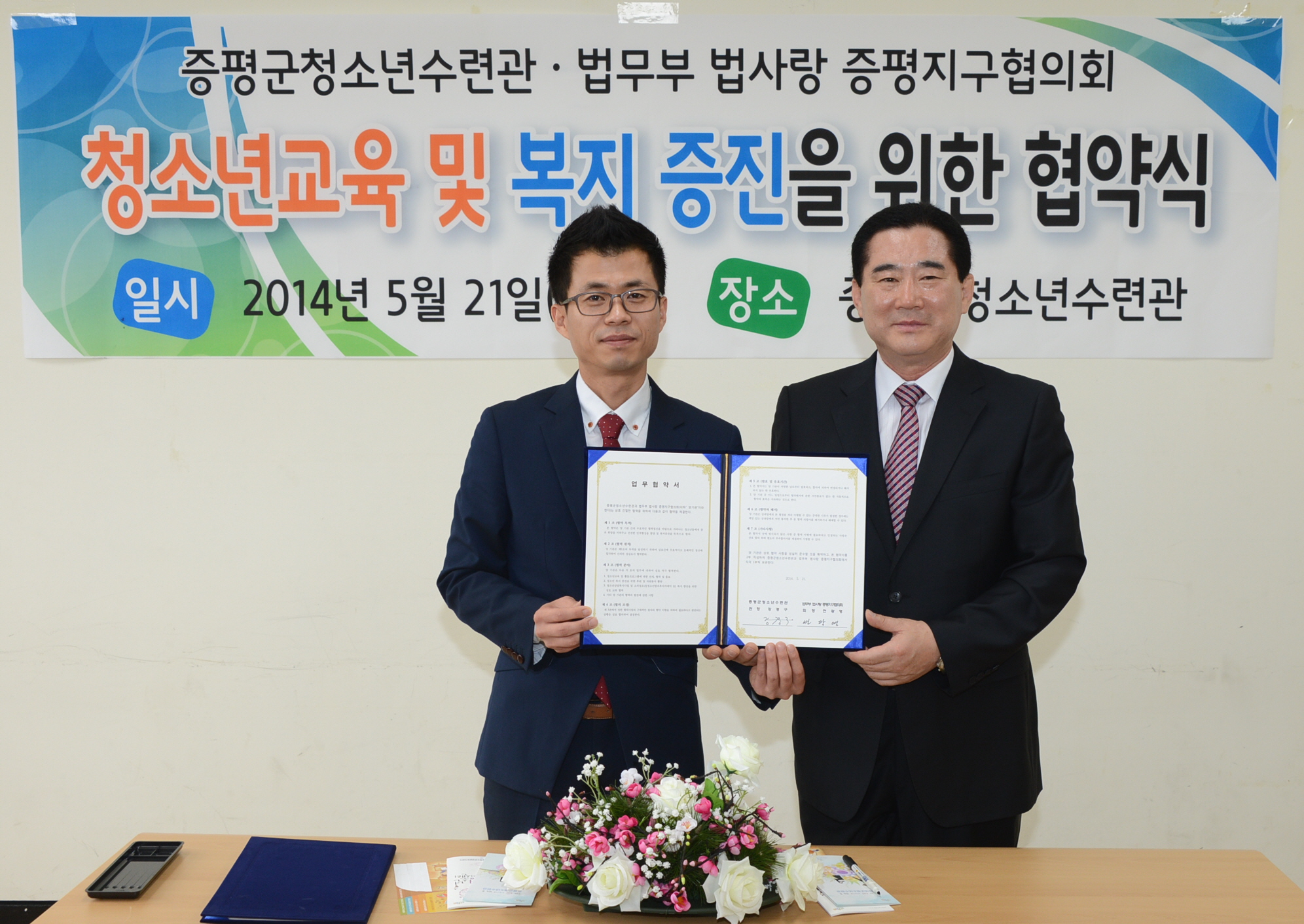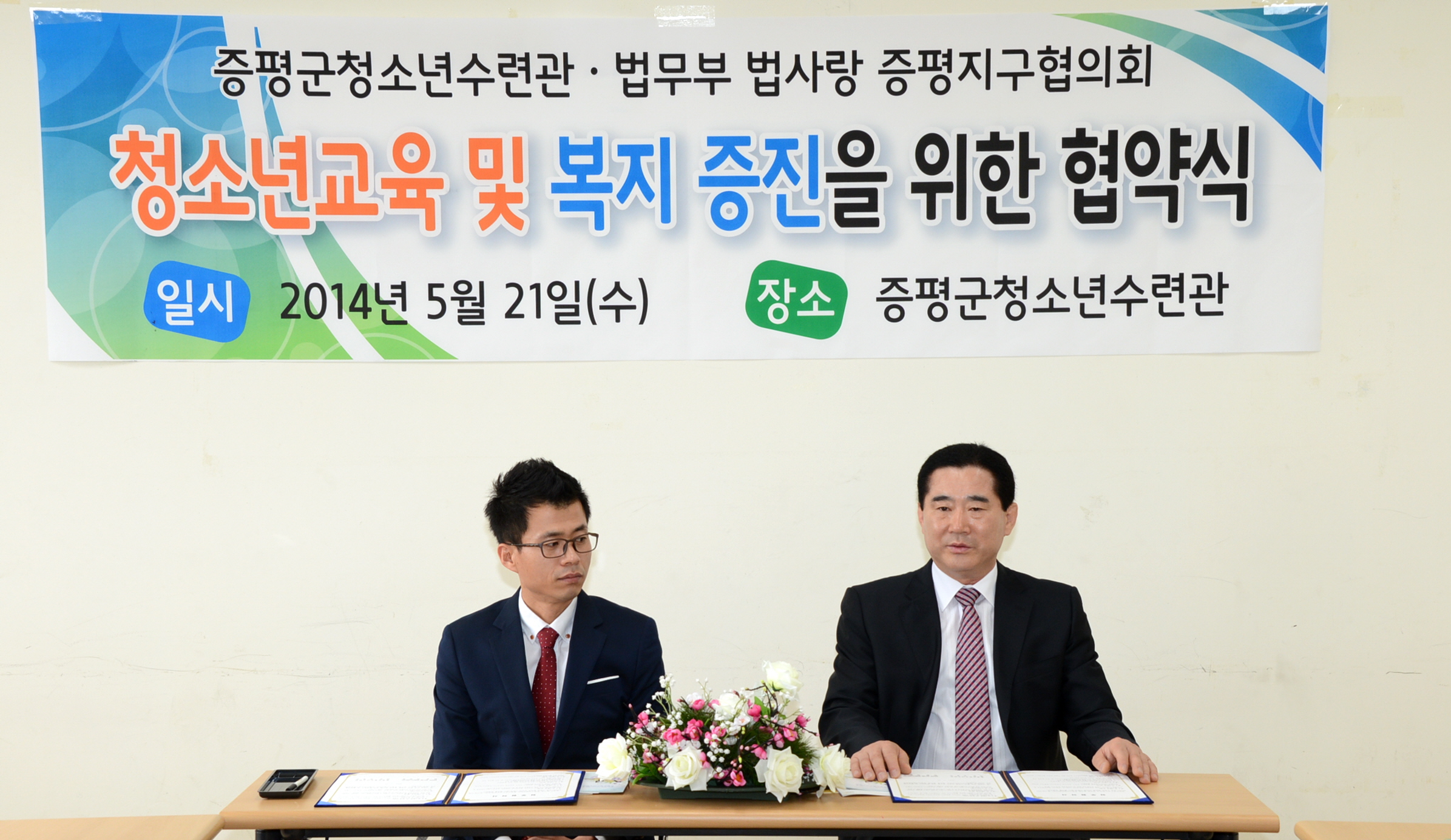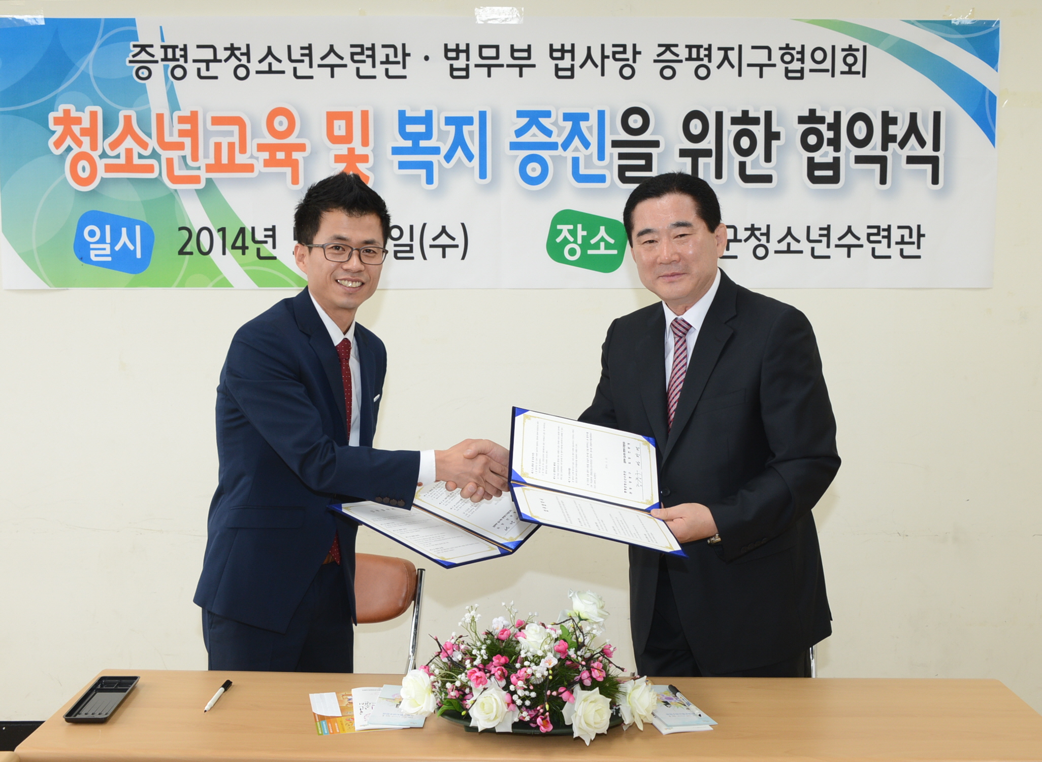 증평군청소년수련관(관장 강경구)과 법무부산하 법사랑증평지구협의회(회장 연광영)는 21일 증평군 청소년수련관에서 청소년교육 및 복지 증진 후원을 위한 협약식을 체결했다. [보도자료실 참조]