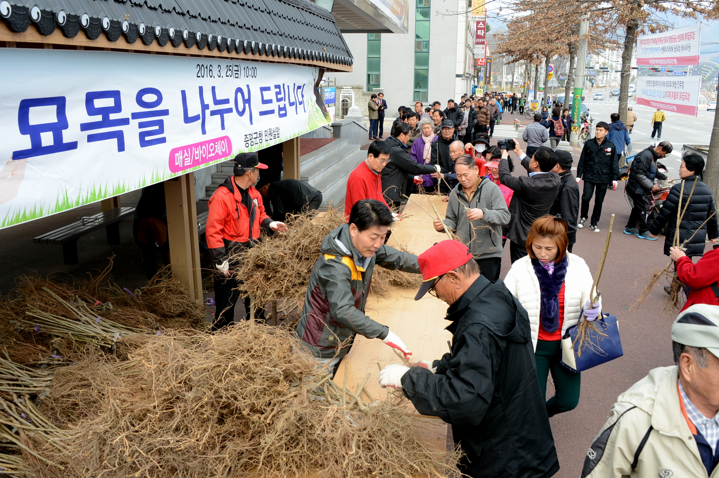 증평군은 제71회 식목일을 기념해 25일 오전 10시 군청 민원실 앞에서 ‘나무 나눠주기’행사를 갖고, 1인당 3그루씩(매실2, 바이오체리1) 총1,500그루를 주민 500명에게 나눠줬다.(보도자료실 참조)