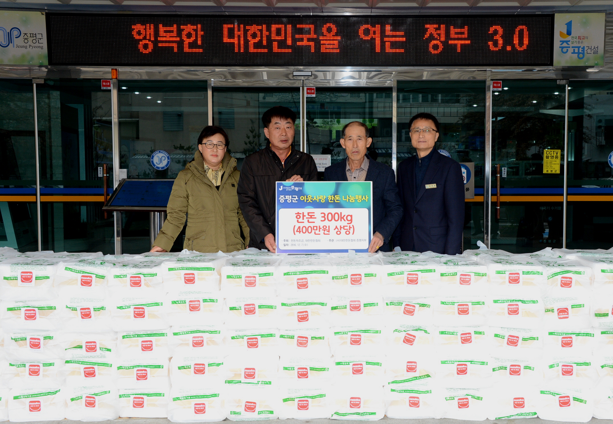 한돈협회 증평군지부(지부장 연규원)은 7일 증평군청을 방문하여 어려운 이웃들을 위해 써달라며 증평군에 한돈 300kg(400만원 상당)을 기탁했다.(보도자료실 참조)