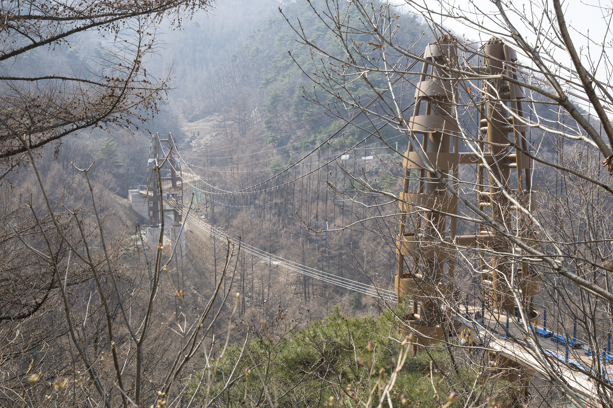 중부권 최고 휴양지인 증평 좌구산 휴양랜드에 조성중인 좌구산 보도현수교가 웅장한 자태를 드러냈다.