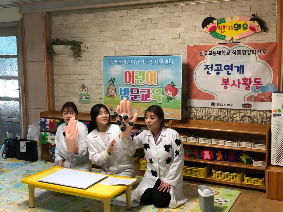 증평군어린이급식관리지원센터(센터장 이경행 학국교통대 식품영양학전공 교수)는 23일 증평읍 초중리 엔젤어린이집에서 아이 18명을 대상으로 다함께 쑥쑥! 어린이 식생활 교육’을 실시했다.