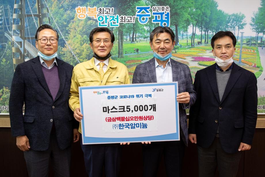 증평군 도안면에 소재한 한국알미늄(대표 김창호)은 코로나19 위기 극복을 위해 사용해 달라며 증평군에 마스크 5000장(385만원 상당)을 기탁했다.