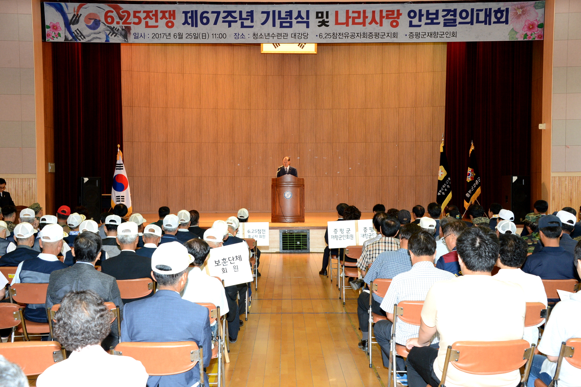 증평군은 25일 오전 11시 증평읍 내성동 충혼탑과 청소년수련관에서 홍성열군수를 비롯한 기관단체장과 6.25 참전용사, 보훈가족 등이 참석한 가운데 6.25전쟁 제67주년 기념식 및 나라사랑 안보 결의대회를 개최했다[보도자료실 참조]