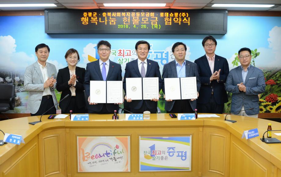 증평군은 26일 군청 소회의실에서 충북사회복지공동모금회(회장 이명식), 롯데쇼핑(주)신선품질혁신센터(센터장 배효권)와 함께 지역 저소득 가구 및 사회복지시설 등에 지속적인 현물지원 기반을 마련하기 위해 업무 협약을 맺었다.