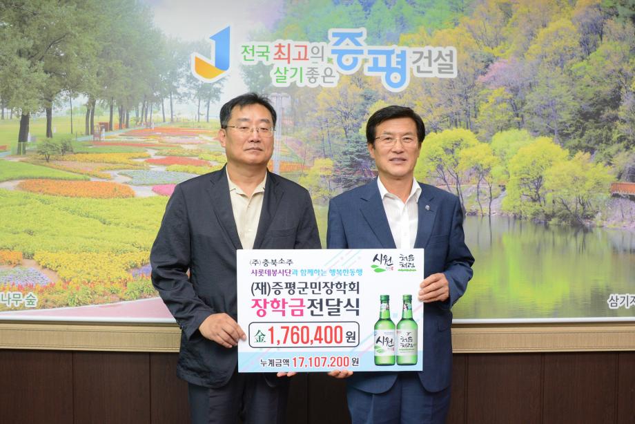 (주)충북소주(대표 조성호)는 25일 증평군청을 방문해 (재)증평군민장학회(이사장 홍성열 증평군수)에 장학사업을 위한 장학기금 176만400원을 기탁했다.