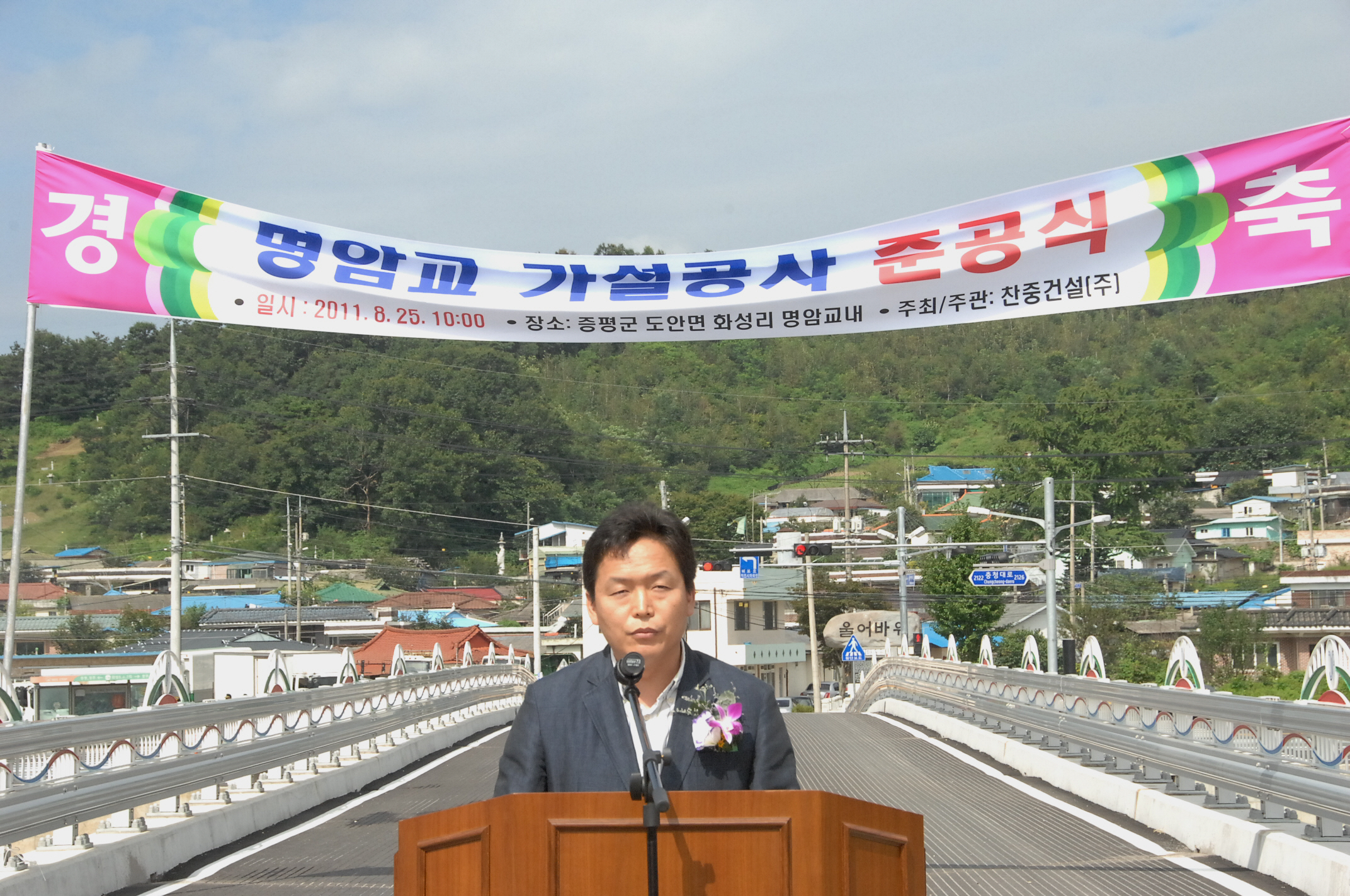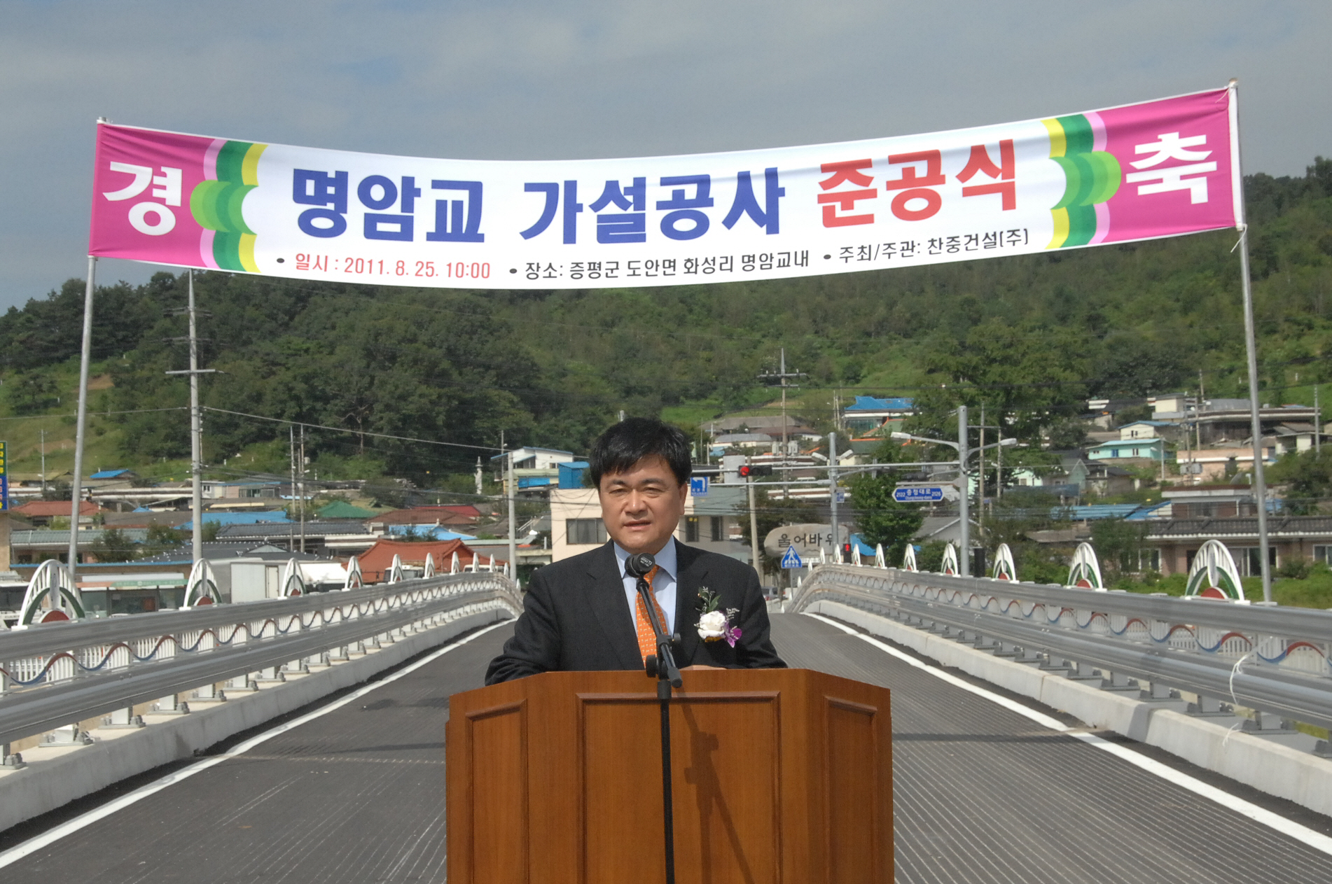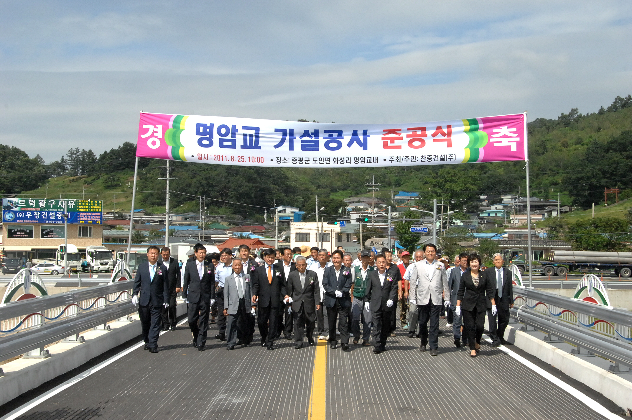 증평군을 통과하는 국도 36호선 인근 도안면 화성리 명암마을과 도당리 방면을 연결하는 명암교 가설공사가 완료됨에 따라 시공사인 찬중건설은 25일 오전 10시 명암교에서 준공식을 가졌는데,
