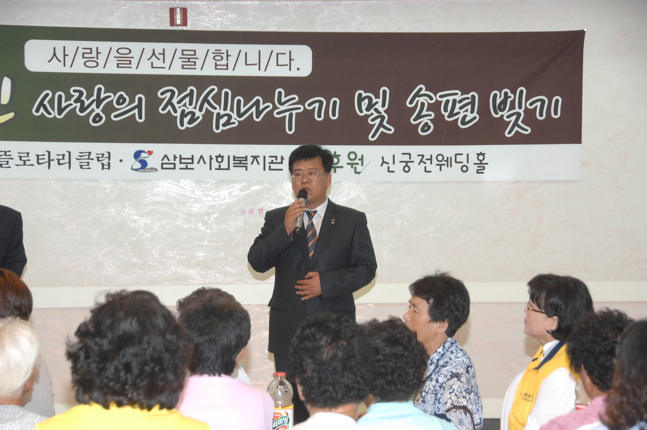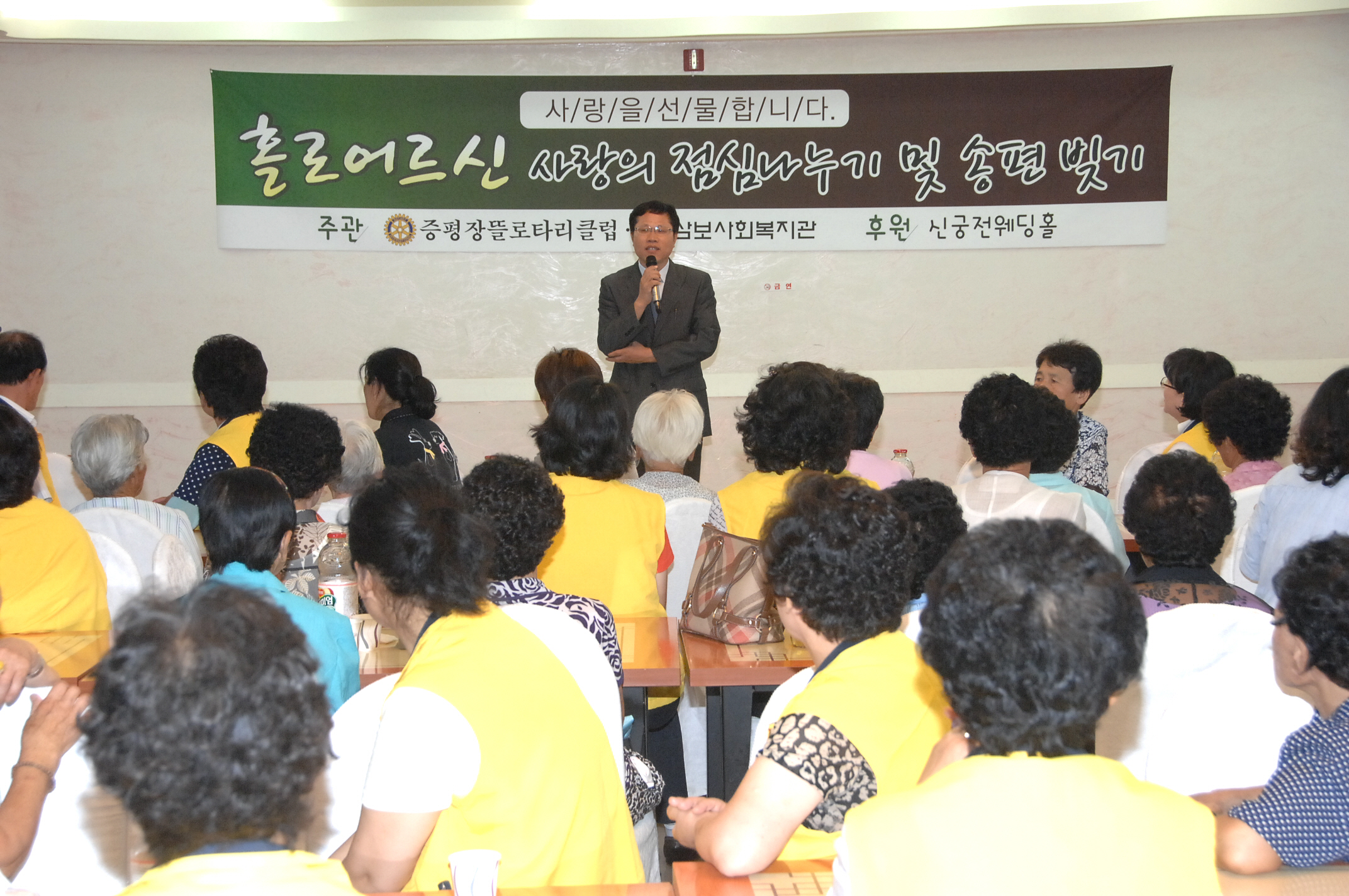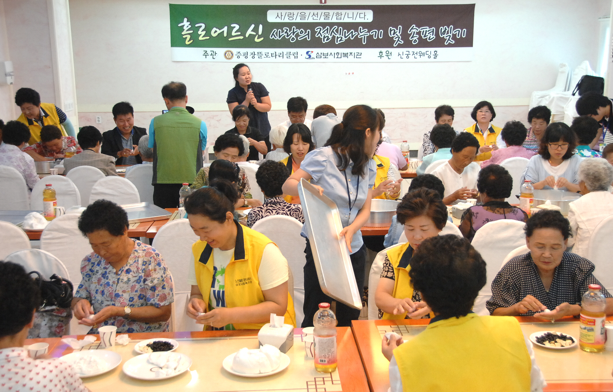 증평 삼보사회복지관이 주관하고 증평장뜰로타리클럽(회장 주기영)이 후원하는 홀로어르신 점심, 송편 나누기 행사가 6일 오전 11시 증평 신궁전웨딩홀에서 열렸다. [보도자료실 참조]