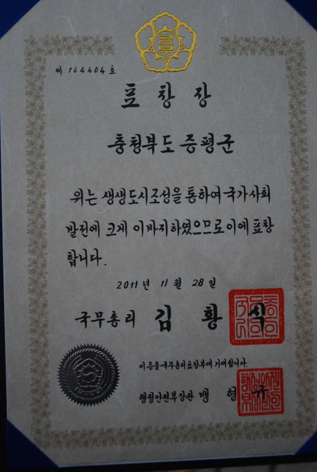 증평군은 28일 정부중앙청사에서 열린 2011 생생도시 경연대회 시상식에서 국무총리상을 수상했다.