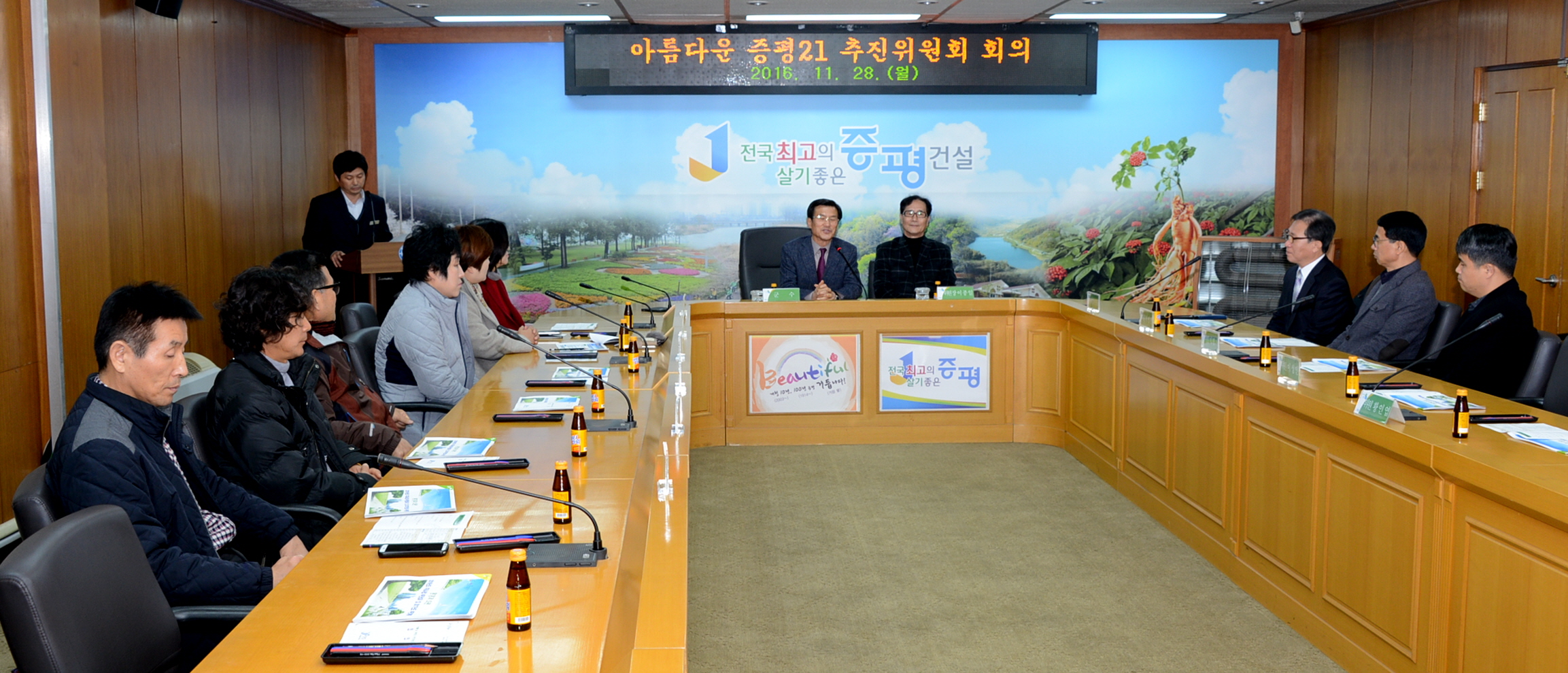 증평군은 28일 군청소회의실에서 지속가능한 발전을 위한 아름다운 증평21 추진위원회 회의를 홍성열군수를 비롯해 추진위원 15명이 참석한 가운데 개최했다.[보도자료실 참조]