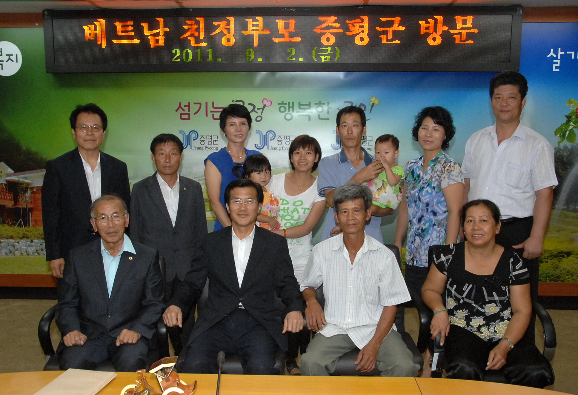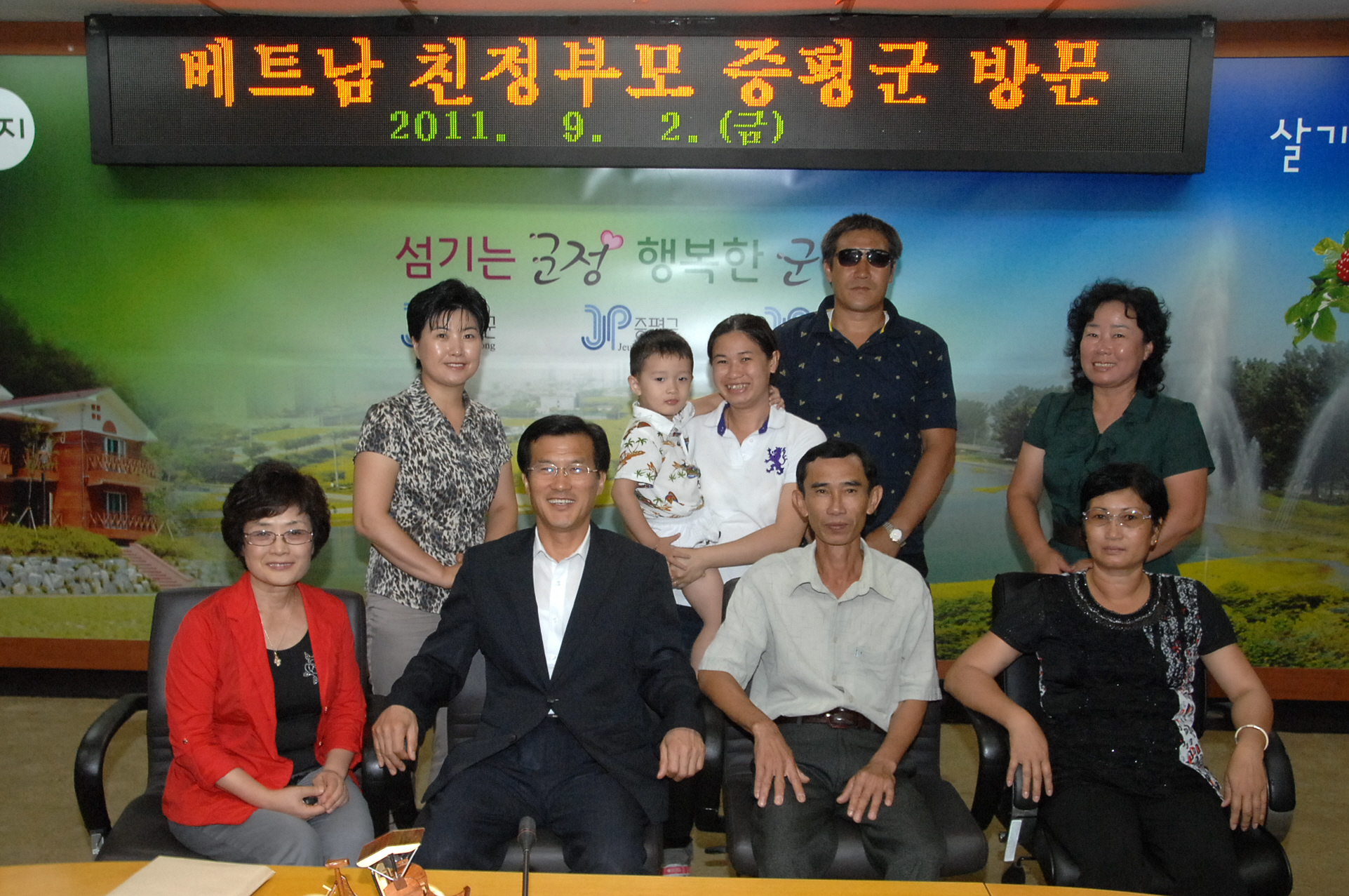 증평군 잔티투이완(24세)씨와 도티 쭉 프엉(22세)씨는 남편과 친정부모를 비롯해 김남순 증평군여성단체협의회장 등 임원과 함께 2일 오후 2시 군청을 방문해 홍성열 증평군수와 환담을 나눴다.[보도자료실 참조]
