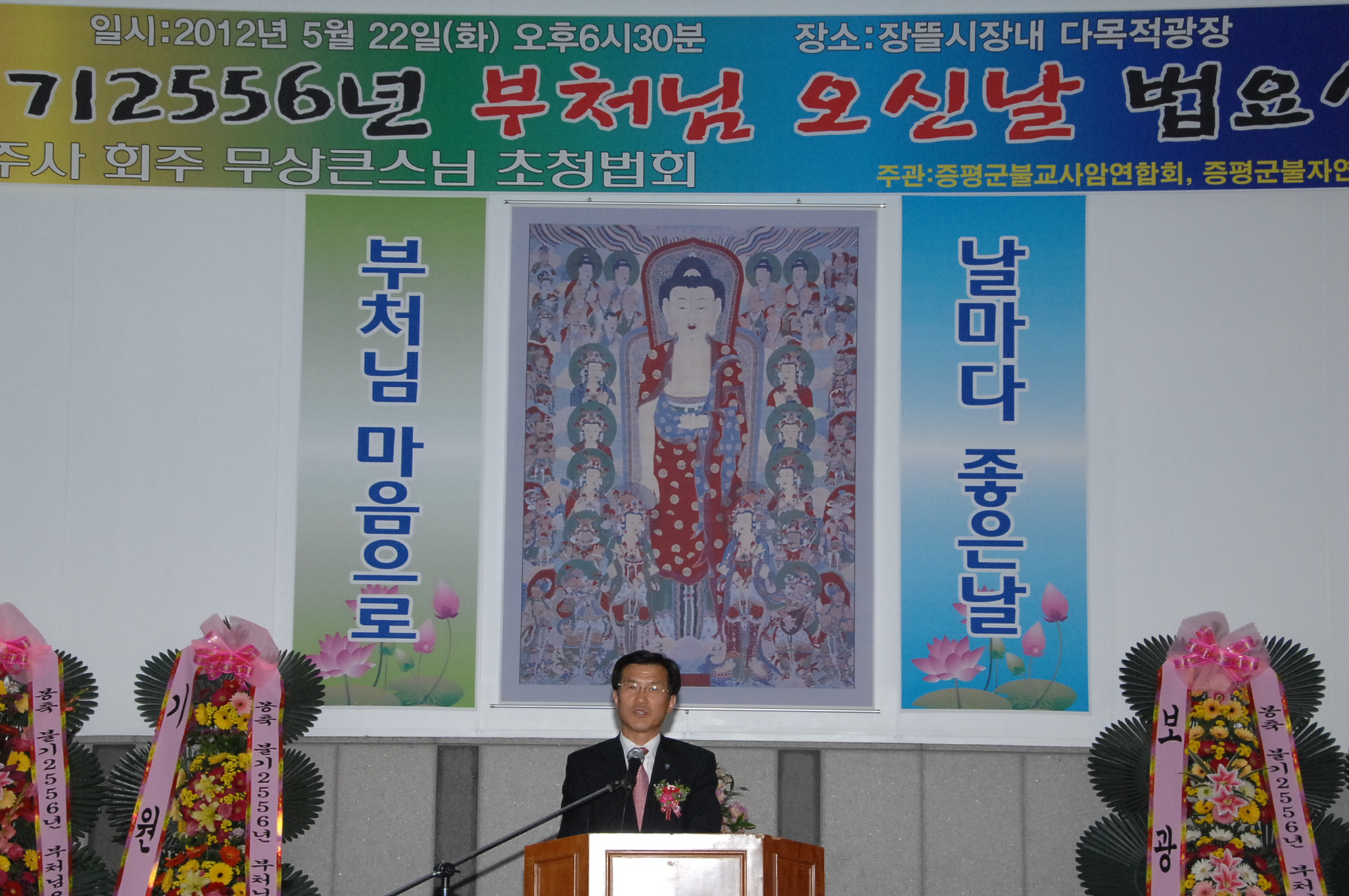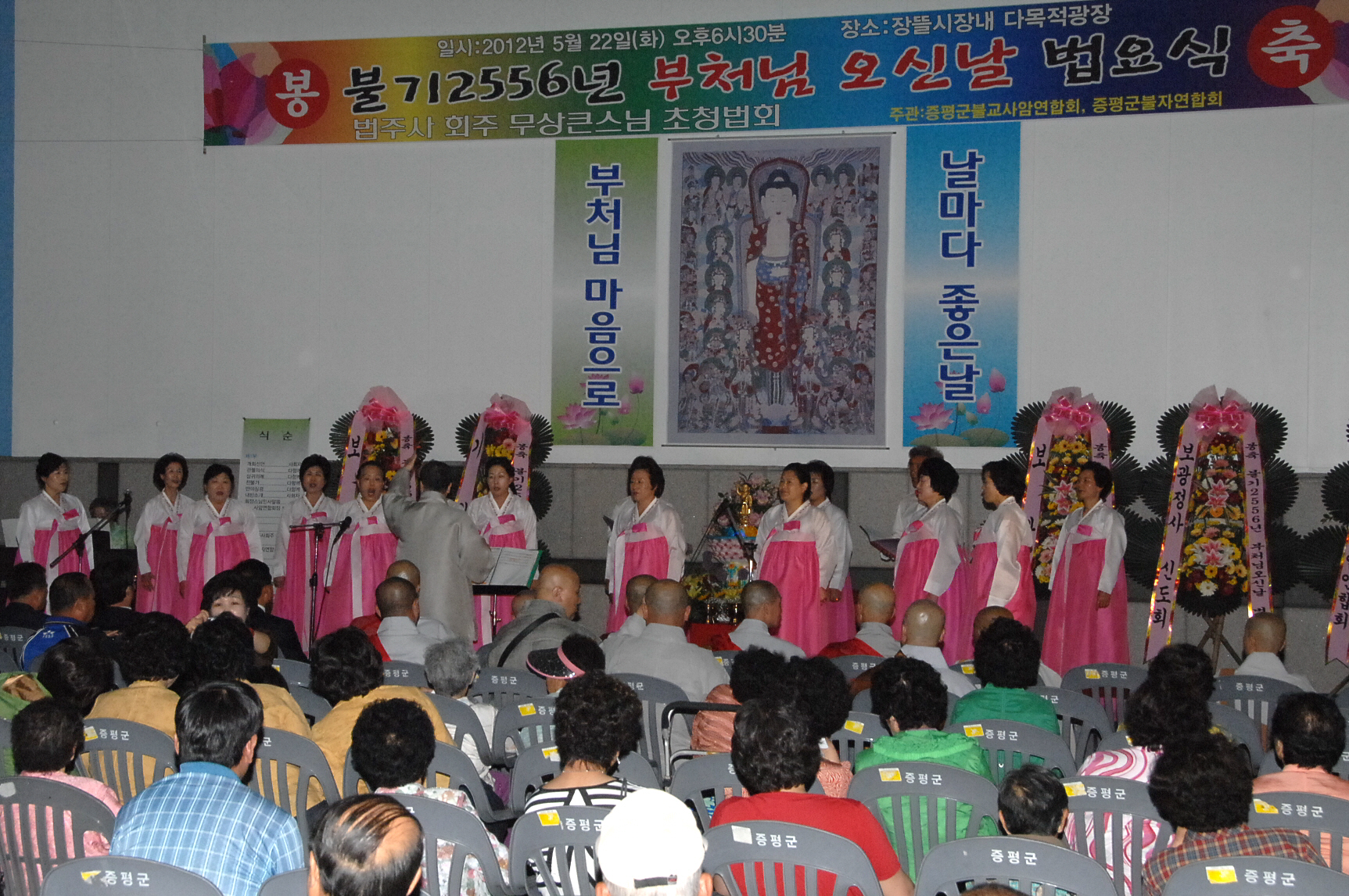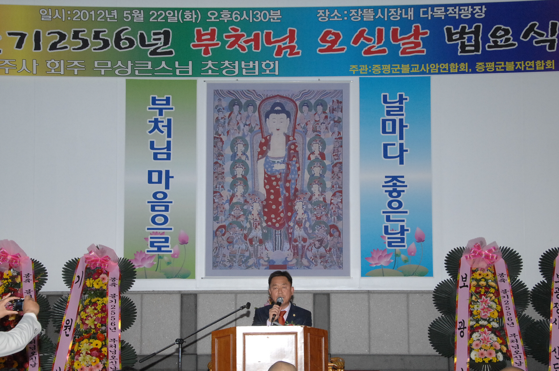 불기2556년 부처님 오신 날 법요식이 22일 오후 6시 30분 장뜰시장내 다목적 광장과 시가지 일원에서 증평군사암연합회(회장.보광스님)와 증평군불자연합회(회장.김선탁) 주관으로 열렸다.