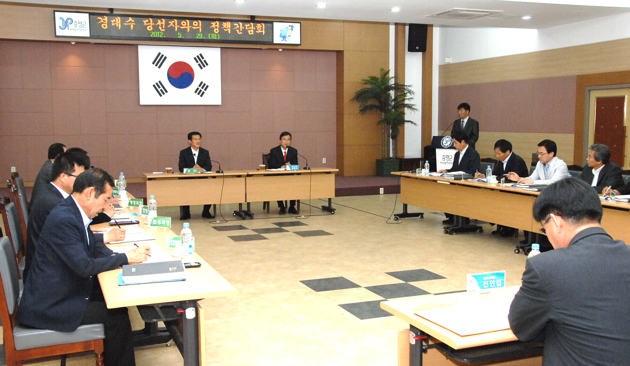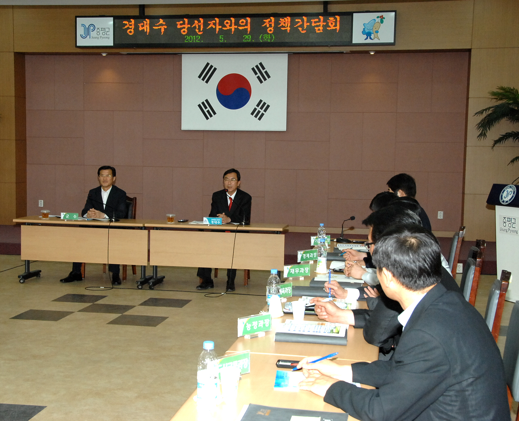 증평군은 29일 오후 2시 군청 대회의실에서 홍성열 군수를 비롯한 관계 공무원 20여명이 참석한 가운데 경대수 국회의원 당선자를 초청해 정책협의를 위한 간담회를 가졌다. [보도자료실 참조]