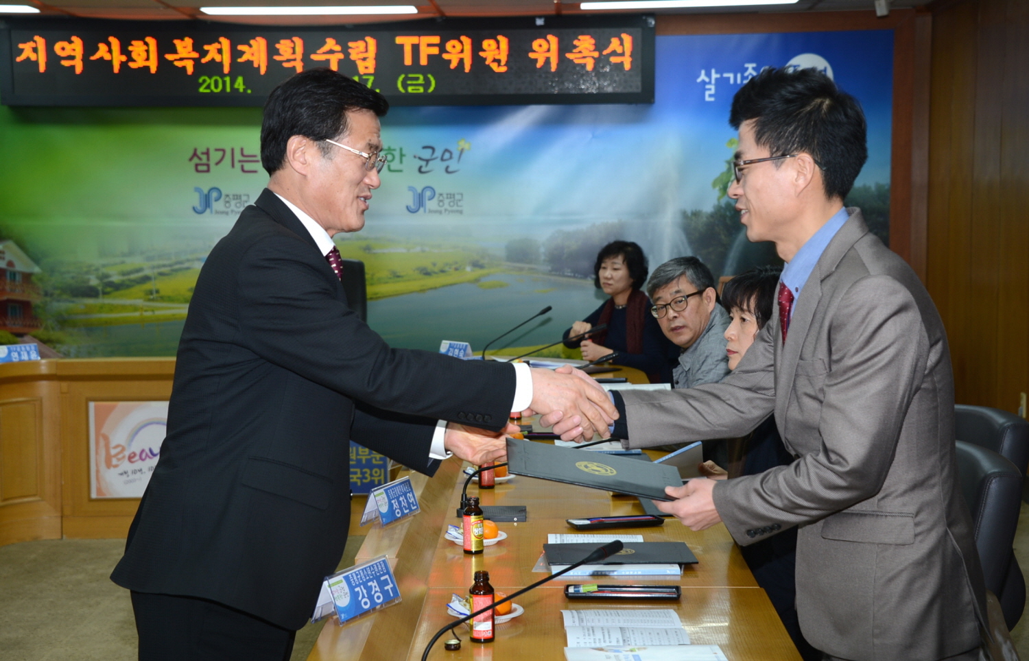증평군은 17일, 증평군청 소회의실에서 2015년부터 2018년까지 증평군 복지의 중장기 계획 수립을 위한 TF팀 위촉식을 개최했다. [보도자료실 참조]