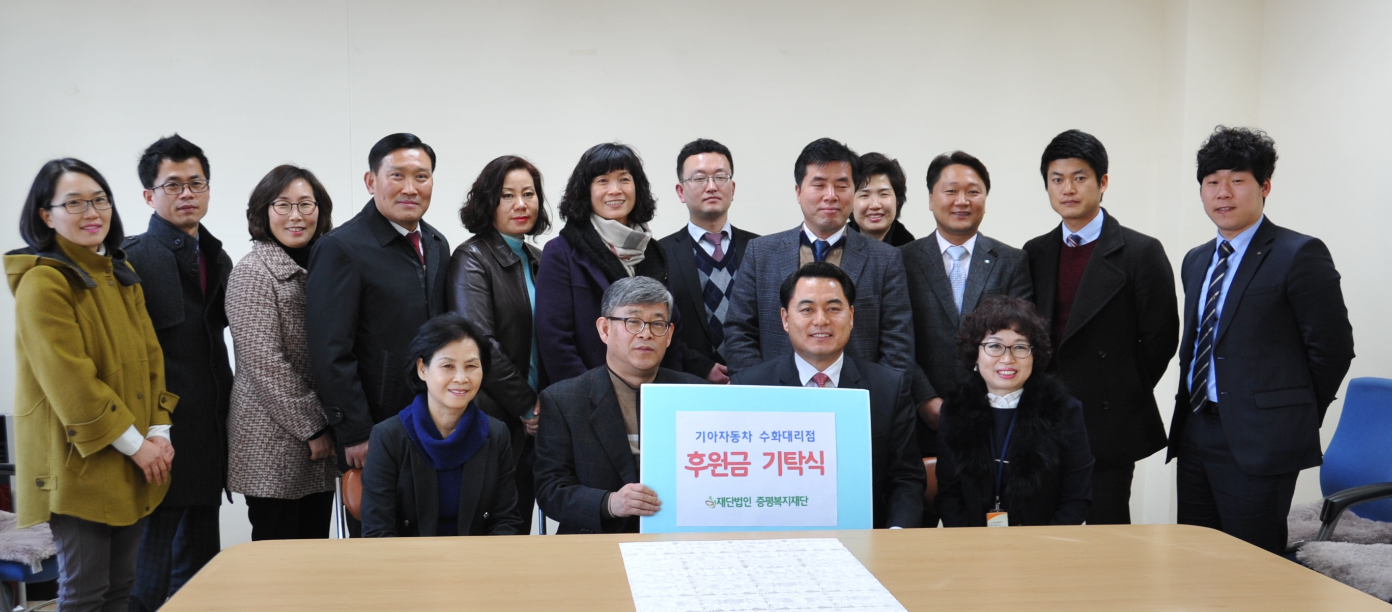 증평군 증평읍 초중리 기아자동차 수화대리점(소장 윤해명)은 5일 2013년도 자동차 429대 판매 수익에 따른 214만 5천원을 지역 복지사업 활성화를 위한 후원금으로 (재)증평복지재단에 기탁했다. [증평보도자료실 참조]