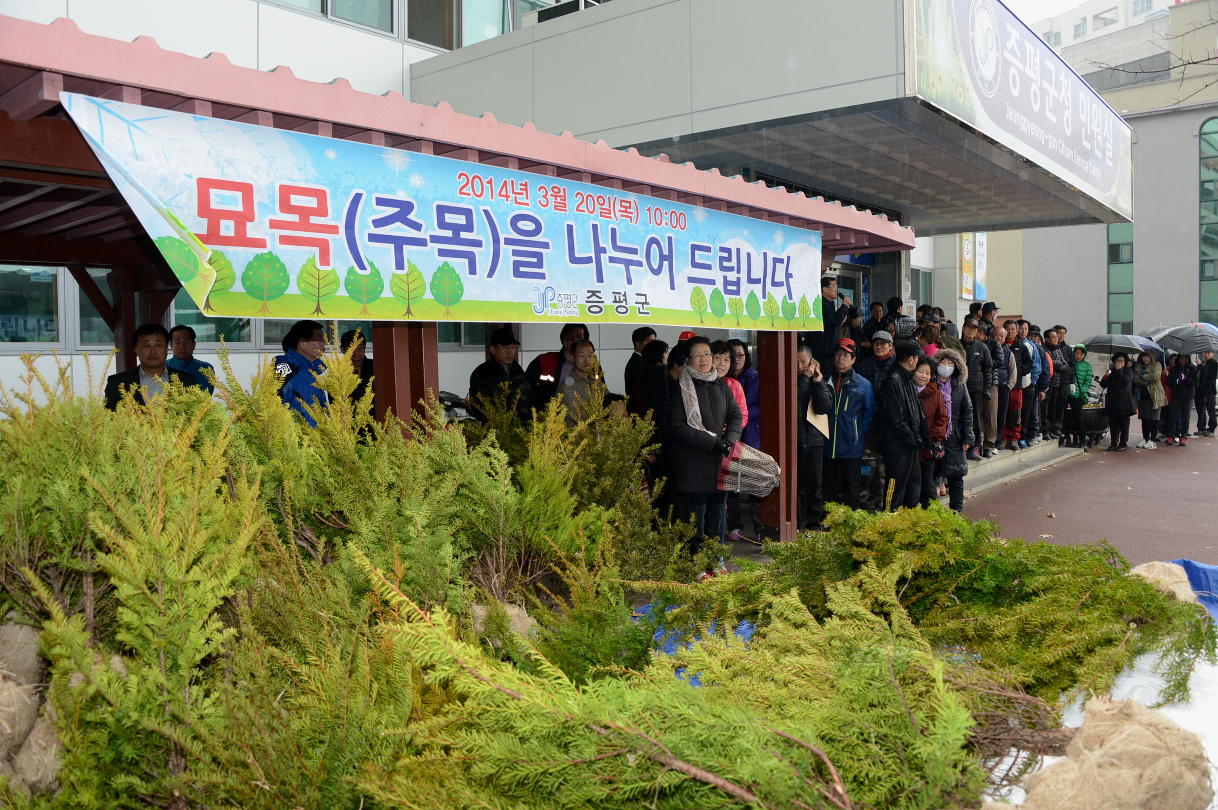 증평군은 제69회 식목일을 기념해 내 나무갖기 캠페인의 일원으로 국민적 공감대를 형성하기 위해 20일 오전 10시 군청 민원실 앞에서 나무나누어주기 행사를 개최했다. [보도자료실 참조]