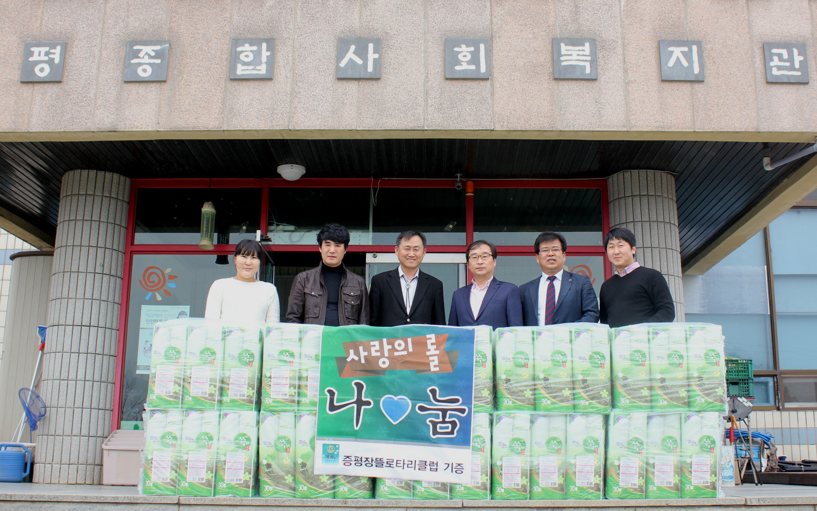 장뜰로타리 클럽(회장.임재욱)이 26일 가정형편이 어려운 저소득 30가정에 사랑을 전달해 달라며 증평종합사회복지관에 롤 휴지 등 생필품을 전달했다. [보도자료실 참조]