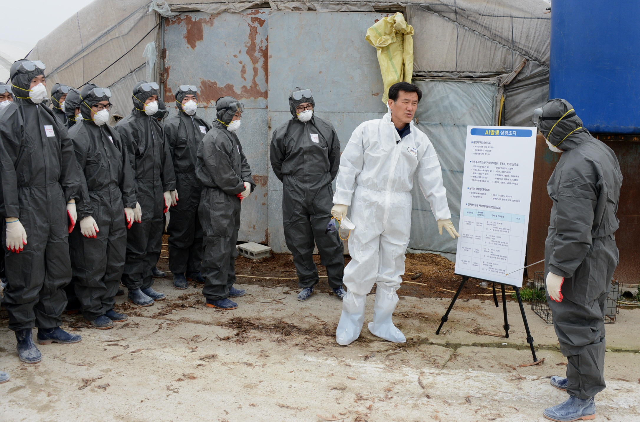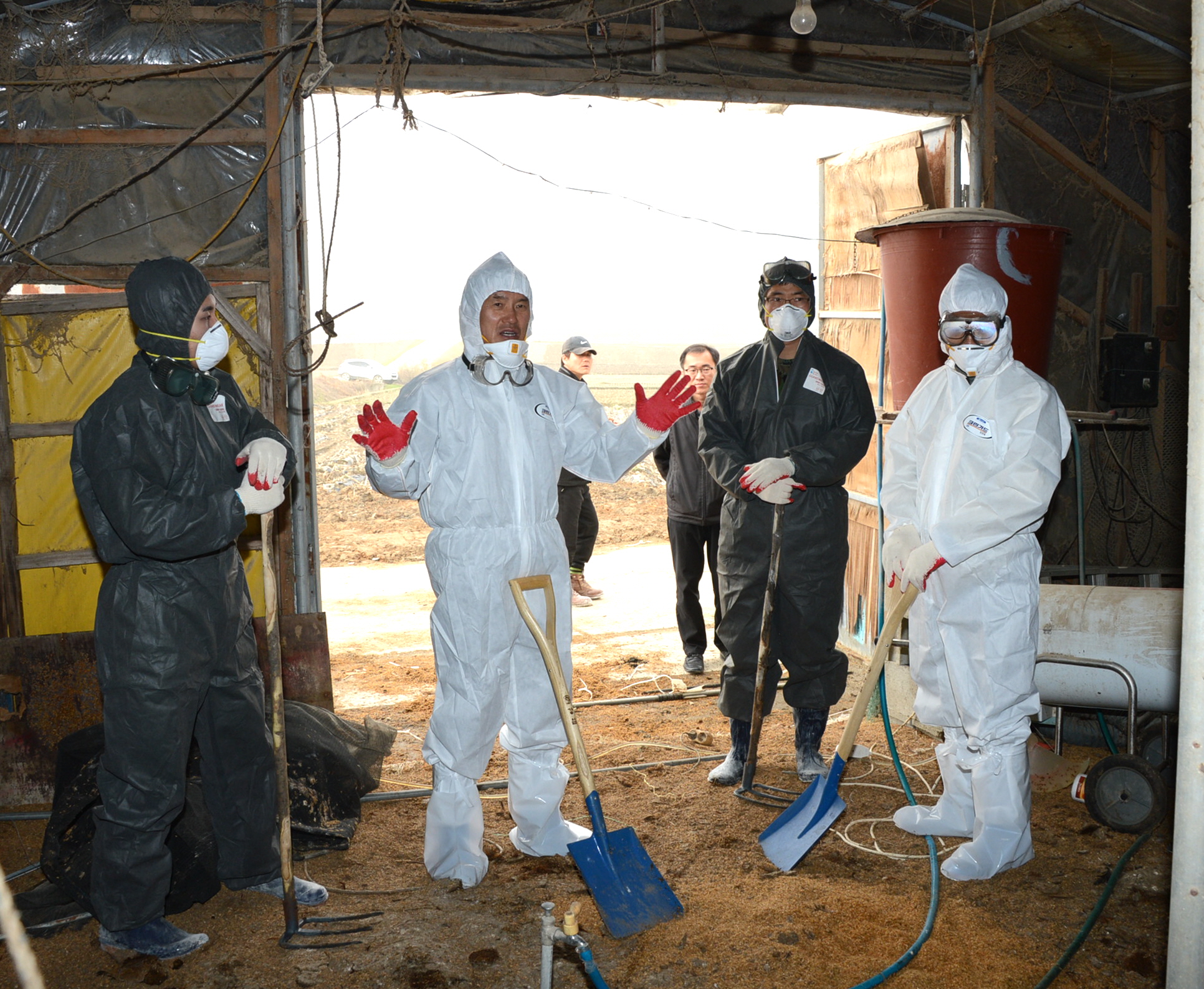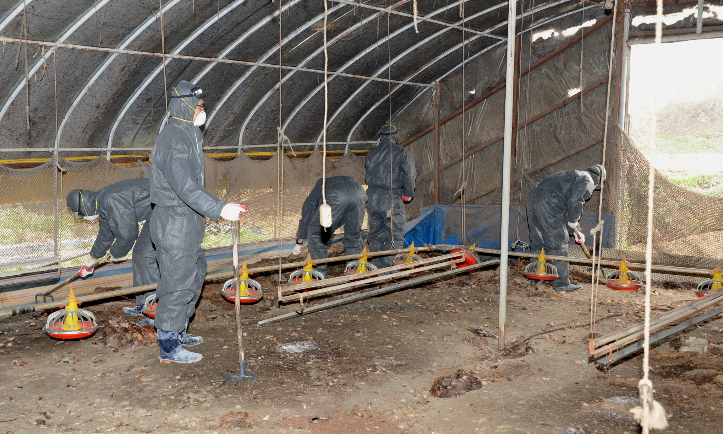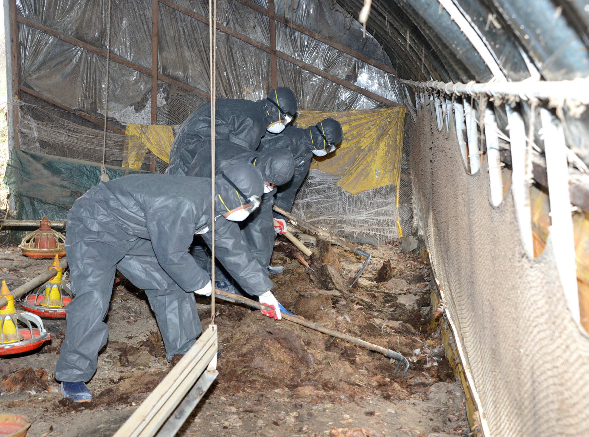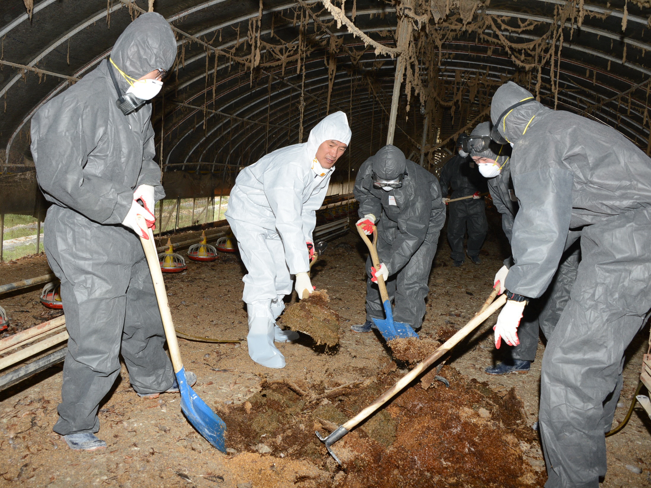 증평군은 고병원성 조류인플루엔자가 발생한 도안면 일원 가금류 살처분하고, 축사 내 축분·사료· 왕겨·약품 등 오염물에 소독처리 등 사후관리를 마친 가운데 홍성열증평군수가 군장병들과 축사내 축분을 걷어내고 있다 [보도자료실 참조]