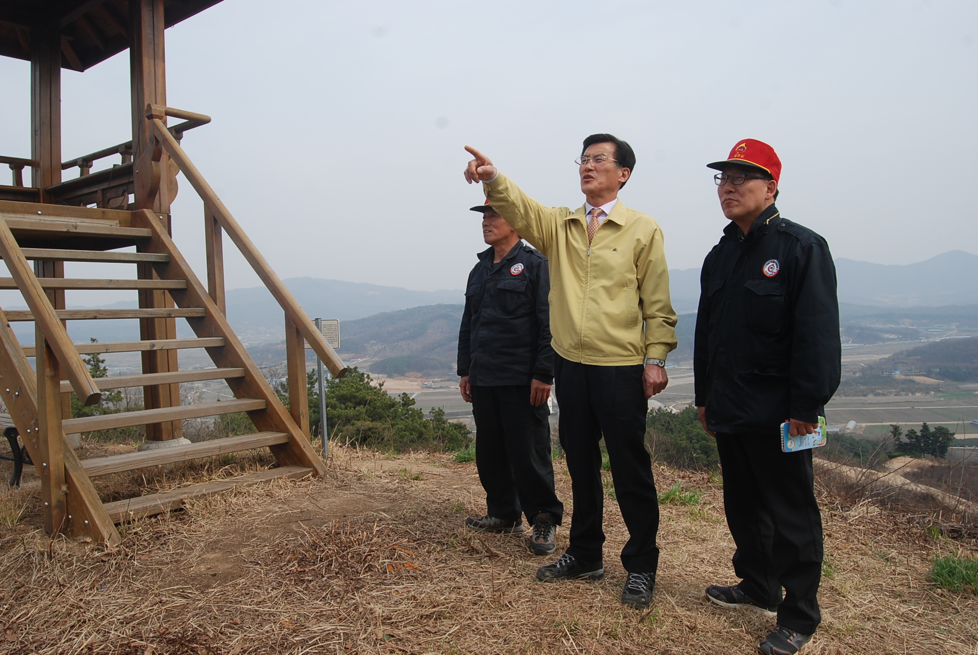 최근 기온 상승과 건조한 봄날씨가 지속되면서 전국적으로 크고 작은 산불이 잇따르자 홍성열 군수는 산림공원사업소장 등과 31일 지역내 산불발생위험지역과 감시현장을 직접 점검했다. [증평보도자료실 참조]