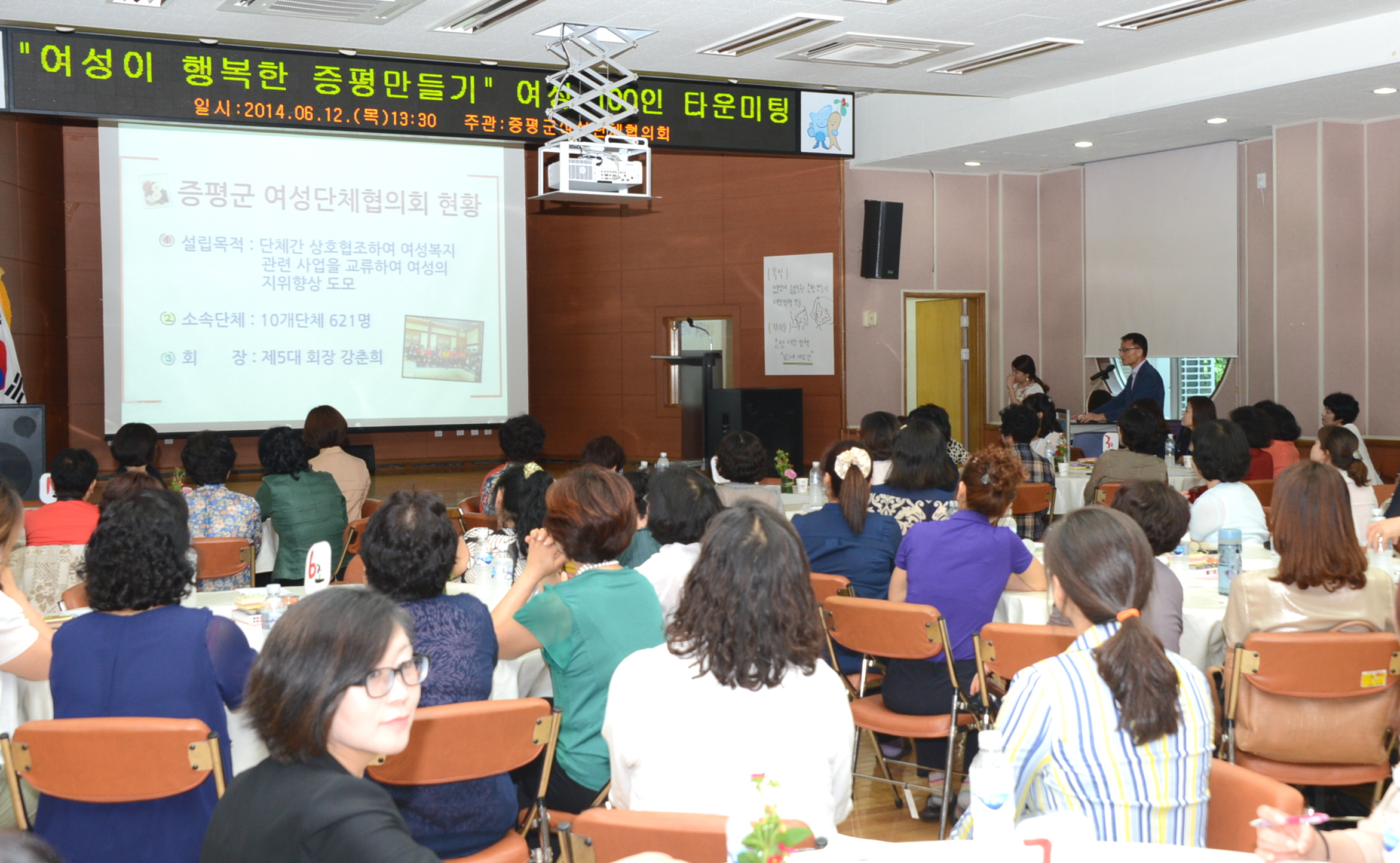 증평군여성단체협의회(회장 강춘희)는 12일 오후 1시30분 율리 휴양촌 신활력관에서 여성이 행복한 대한민국, 여성친화도시 일번지를 향한 『여행(女幸) 증평 만들기 여성 100인 타운미팅』을 개최했다. [보도자료실 참조]