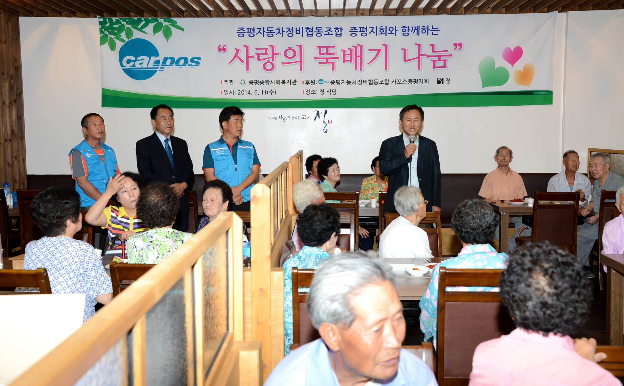 카포스(충북자동차전문정비사업조합) 증평지회와 음식점 ‘정’ 그리고 증평종합사회복지관은 16일 증평읍 송산리 정 식당에서 회원 및 봉사자 20여명이 지역의 소외계층 및 독거어르신 100명에게 ‘사랑의 뚝배기 나눔’봉사를 실시했다. [보도자료실 참조]