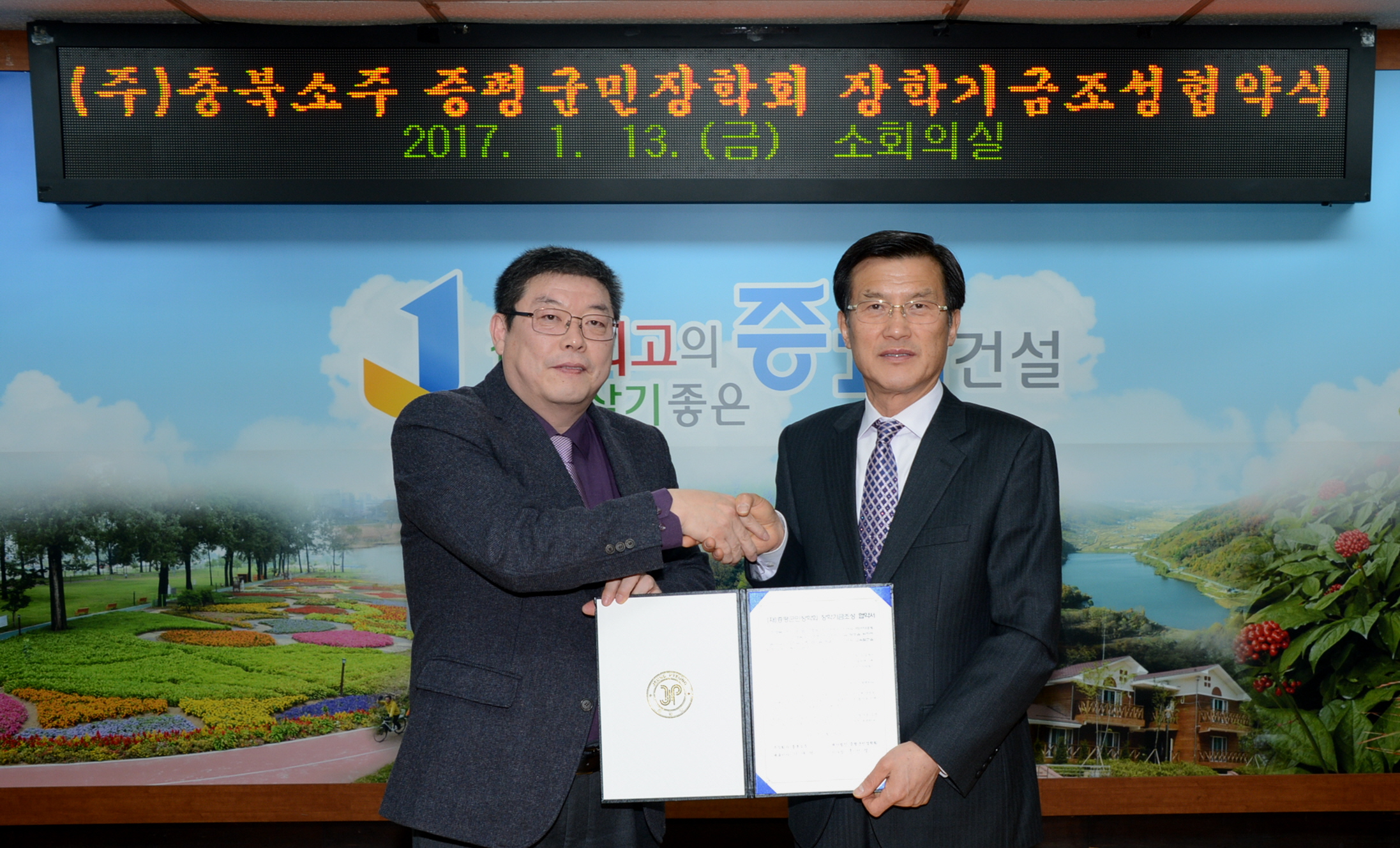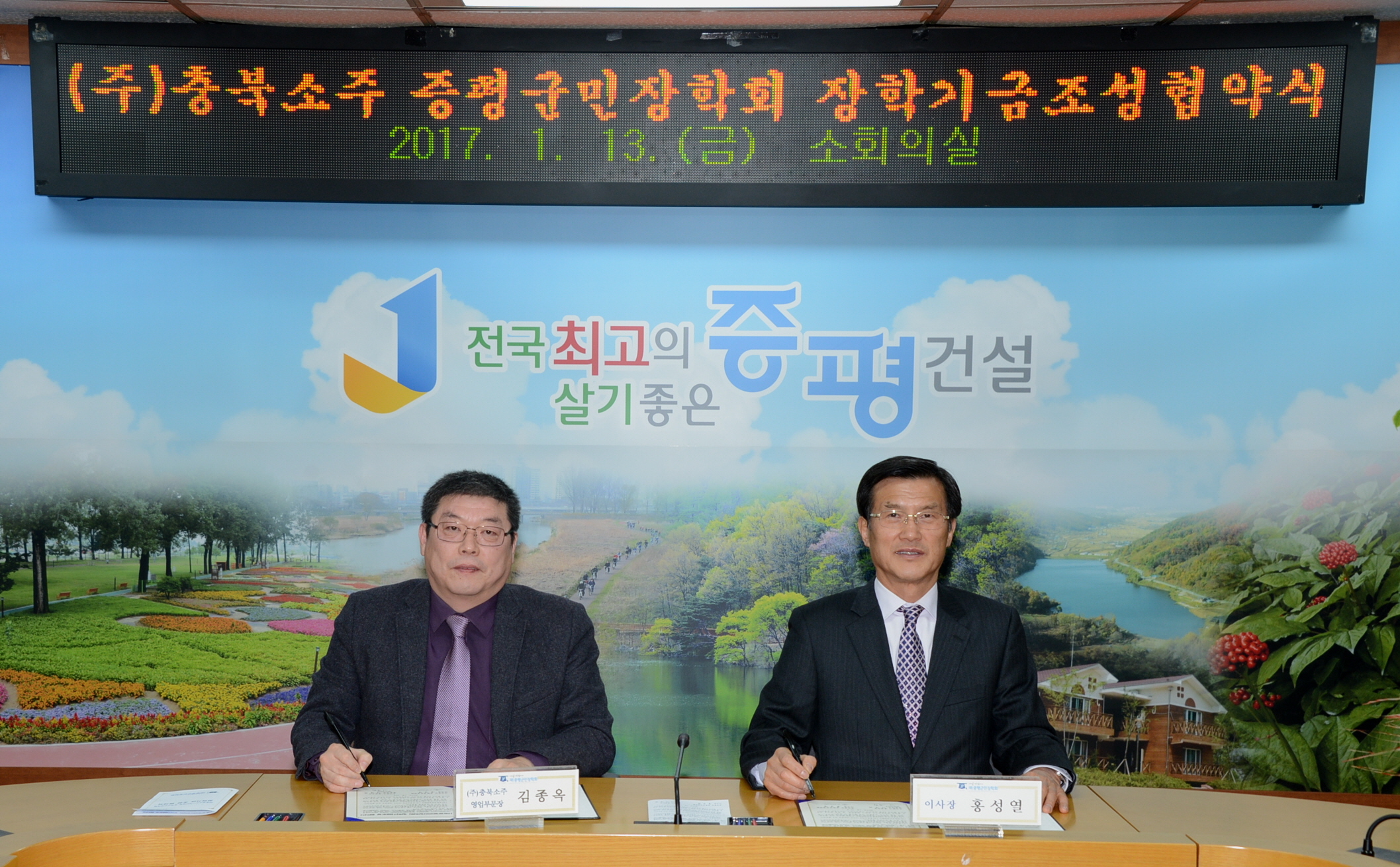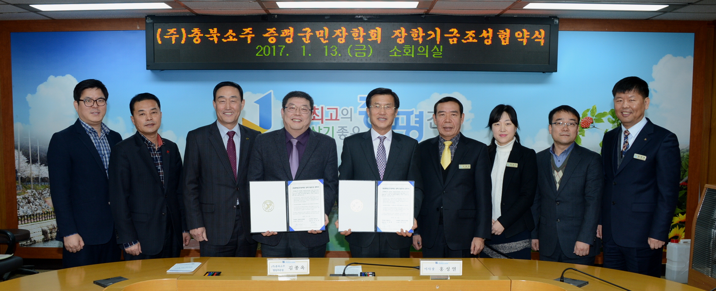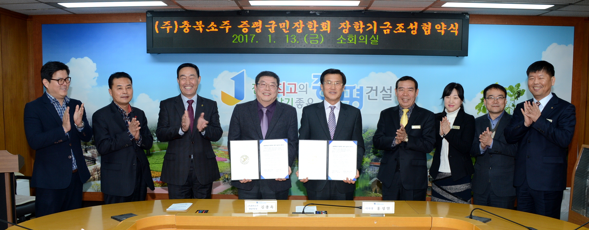 (재)증평군민장학회(이사장 홍성열 증평군수)와 (주)충북소주(대표이사 이재혁)는 13일 군청소회의실에서 2017년 장학기금 조성 협약식을 체결했다.[보도자료실 참조]