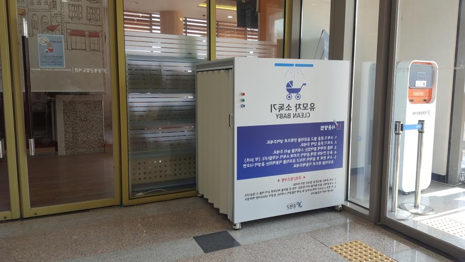 증평군이 출산가정의 건강한 육아를 돕기 위해 증평읍 송산리 증평군립도서관 1층 로비에‘유모차 소독기’를 설치하고 23일부터 소독서비스를 제공한다.(보도자료실 참조)