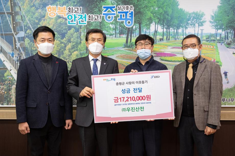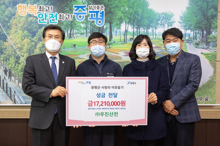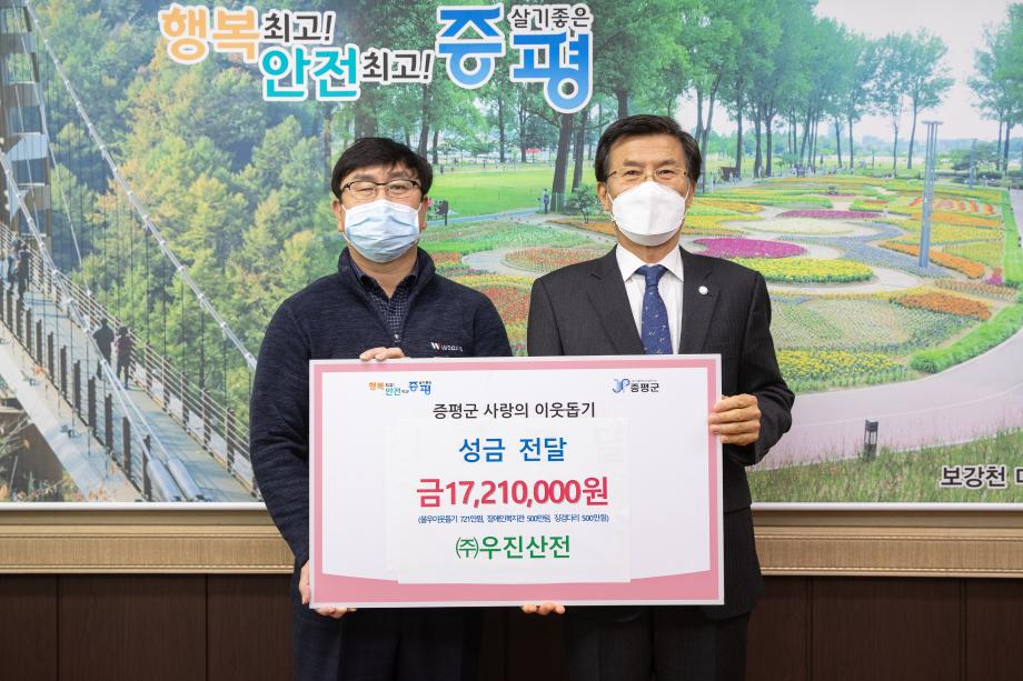 ㈜우진산전은(대표이사 김영창)은 24일 증평군장애인복지관에 500만원, 사단법인 징검다리 증평군지부에 500만원, 증평군 불우이웃돕기 성금으로 721만원 총 1,721만원을 기탁했다.