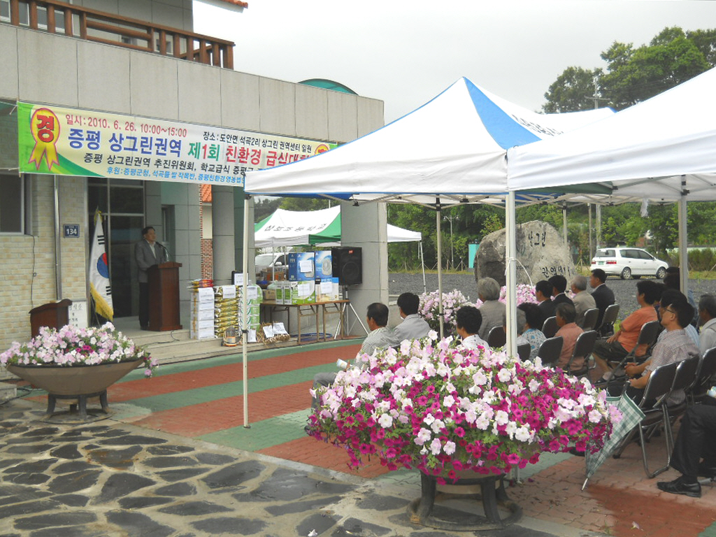 26일 증평군 도안면 석곡리 상그린 권역센터 일원에서 증평군 친환경급식대회 추진위원회 및 상그린 권역 추진위원회의 주최로 학교급식운동본부, 학부모, 영양교사, 소비자단체, 친환경단체, 개인·단체·가족단위 신청희망자, 초정인사 등 약 100여명이 친환경단지 우렁이 투여체험, 오색떡 만들기체험, 감자캐기, 마늘캐기 등 친환경 체험행사와 상그린 권역 경관벨트 건강걷기 등 행사를 개최하였다.[보도자료실 참조]