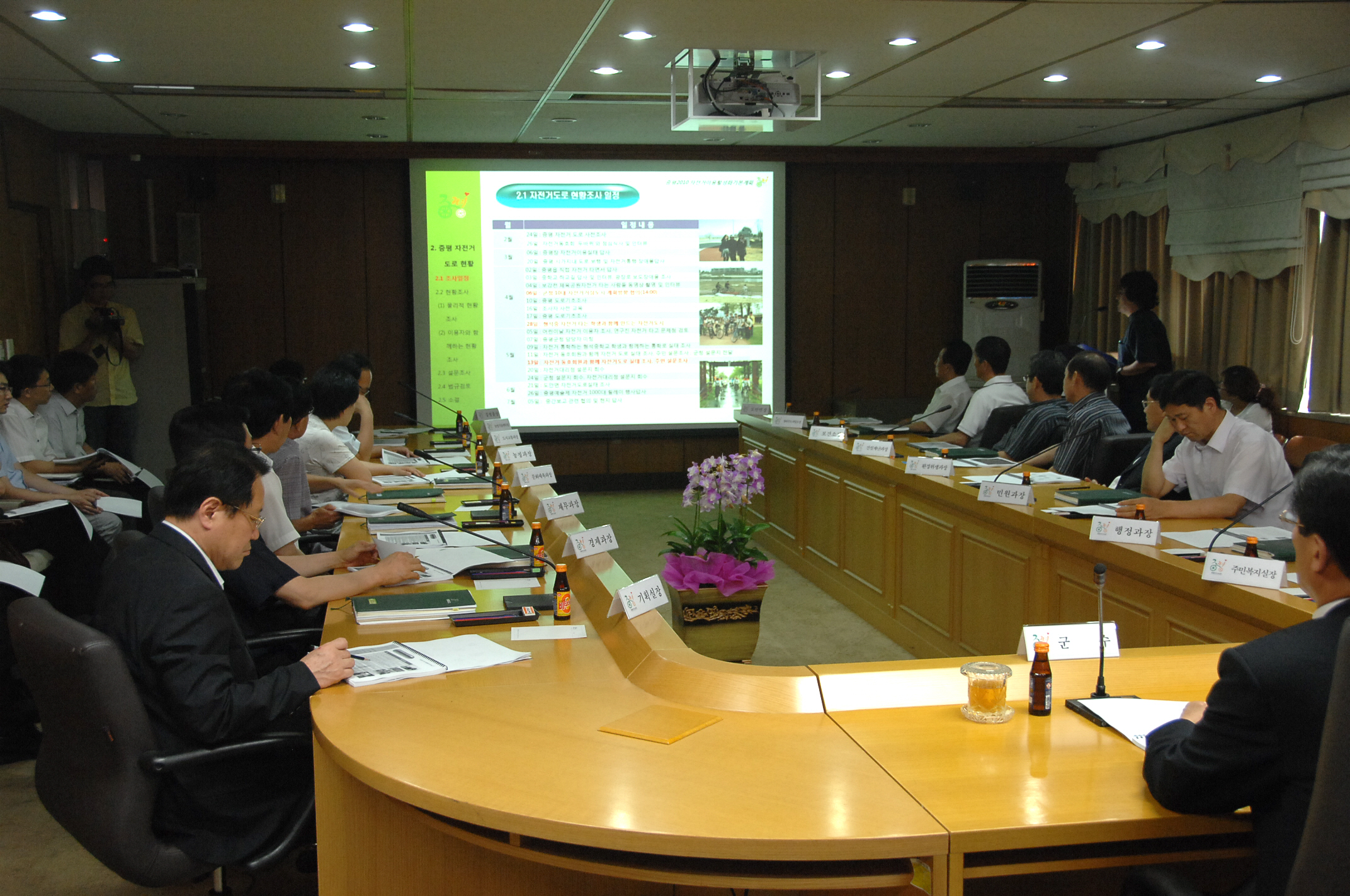 증평군은 14일 오후 2시 군청소회의실에서 홍성열 증평군수를 비롯한 각 실·과장, 관계공무원 등 30여명이 참석한 가운데 자전거 이용활성화 기본계획 수립을 위한 용역 중간보고회를 개최했다.[보도자료실 참조]