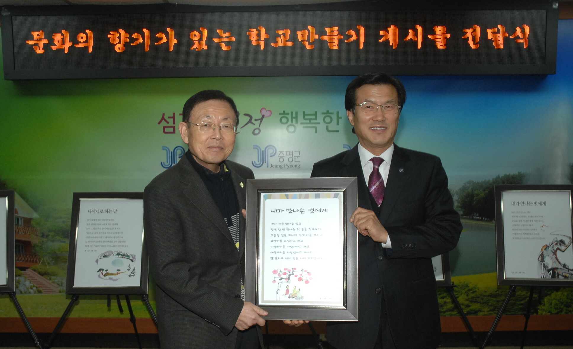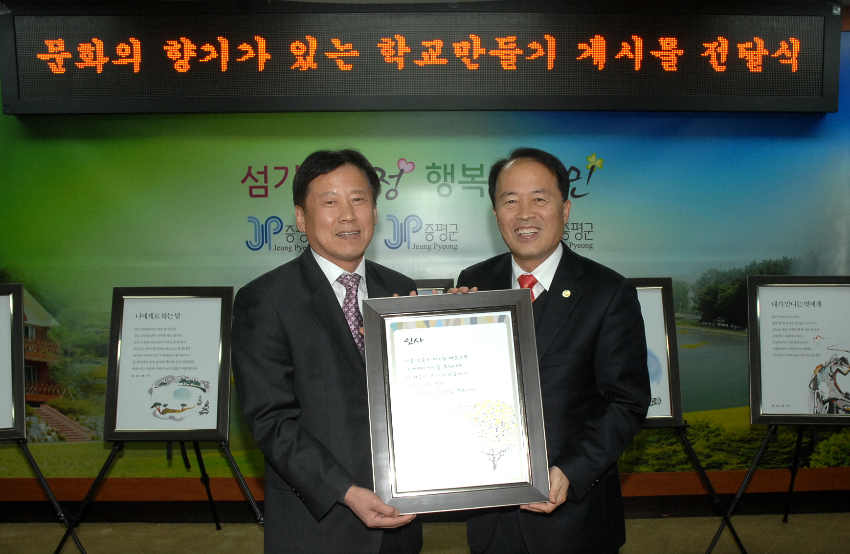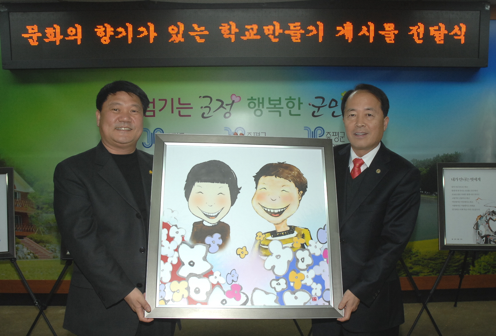 증평군(군수 홍성열)과 괴산증평교육지원청(교육장 김학봉)은 6일 관내 10 개 초중고 교장이 참석한 가운데 문화가 흐르는 작품을 제작하여 각 학교에 전달하는 전달식을 가졌다. 이는 학교 환경개선 및 인성교육을 위한 적극적인 지원으로 지역과 학교의 조화로운 상생의 아름다운 미담이 되고 지역사회의 교육지원에 대한 새로운 지평을 열었다는 평가이다.[보도자료실 참조]