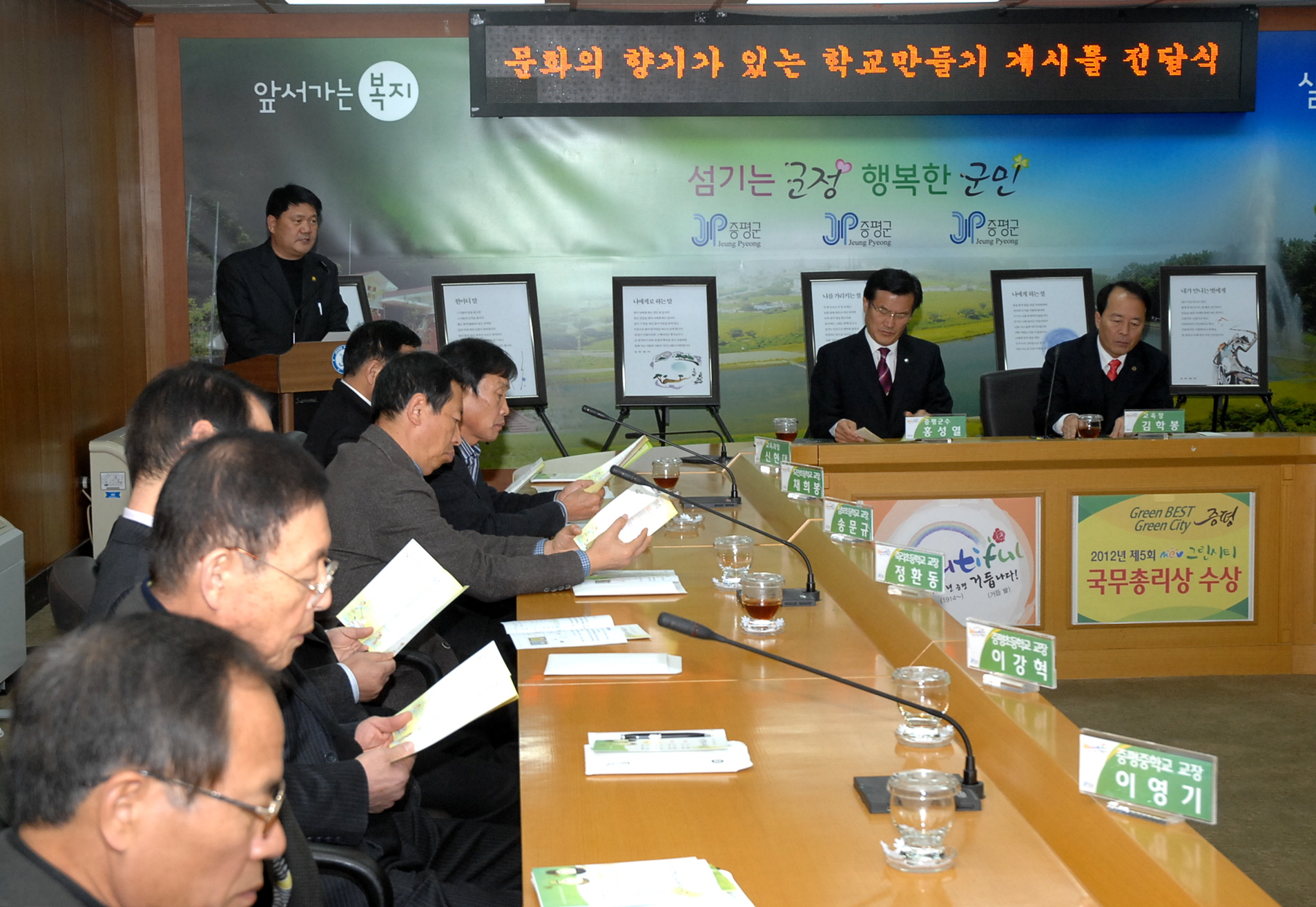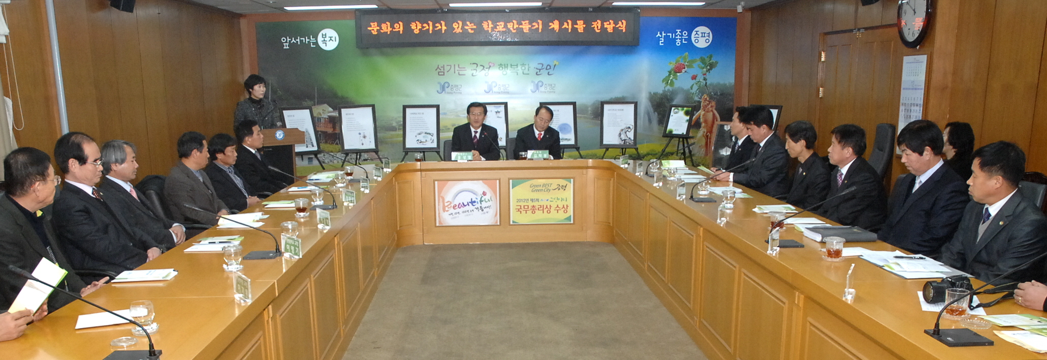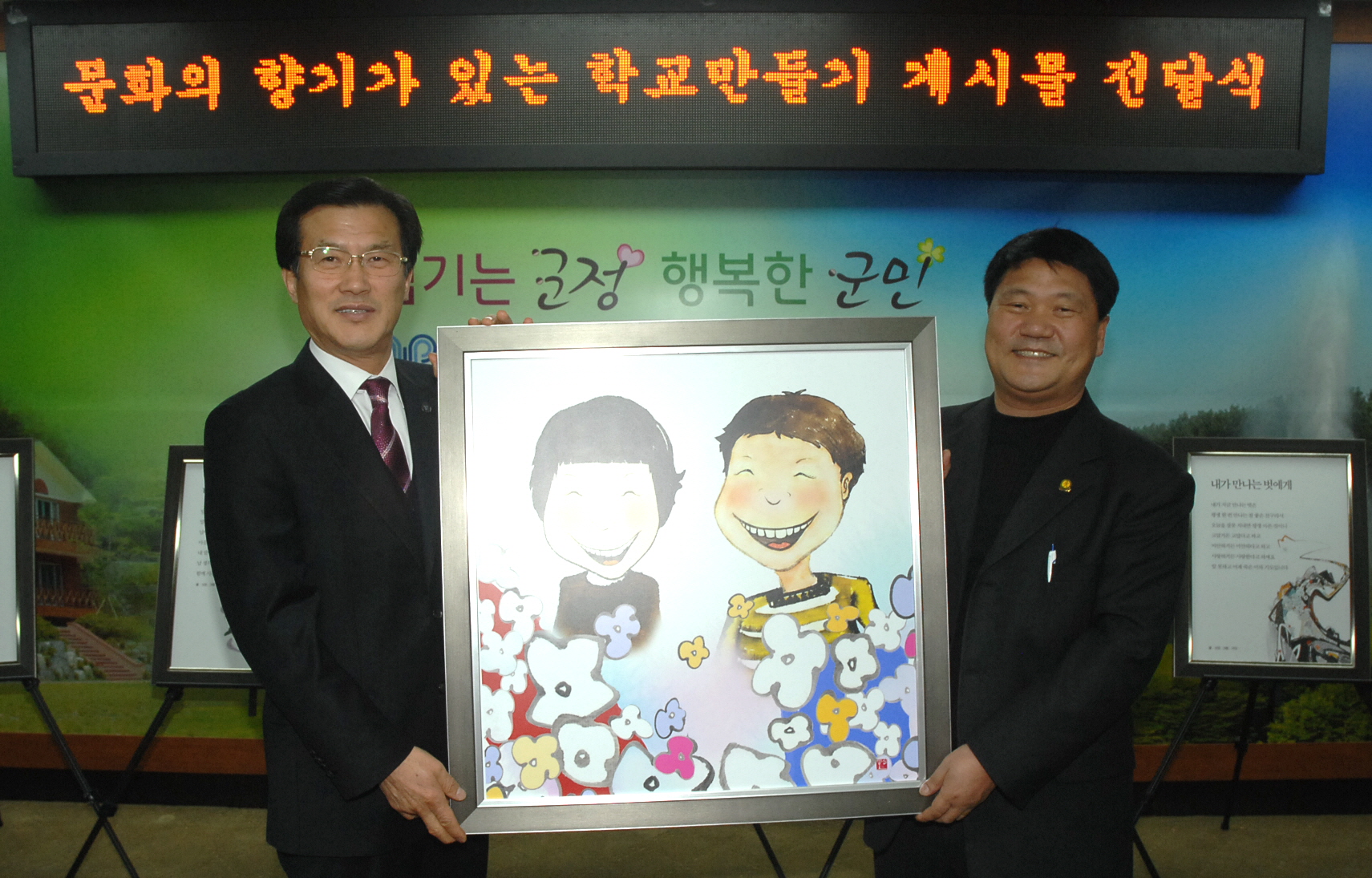 증평군(군수 홍성열)과 괴산증평교육지원청(교육장 김학봉)은 6일 관내 10 개 초중고 교장이 참석한 가운데 문화가 흐르는 작품을 제작하여 각 학교에 전달하는 전달식을 가졌다. 이는 학교 환경개선 및 인성교육을 위한 적극적인 지원으로 지역과 학교의 조화로운 상생의 아름다운 미담이 되고 지역사회의 교육지원에 대한 새로운 지평을 열었다는 평가이다.[보도자료실 참조]