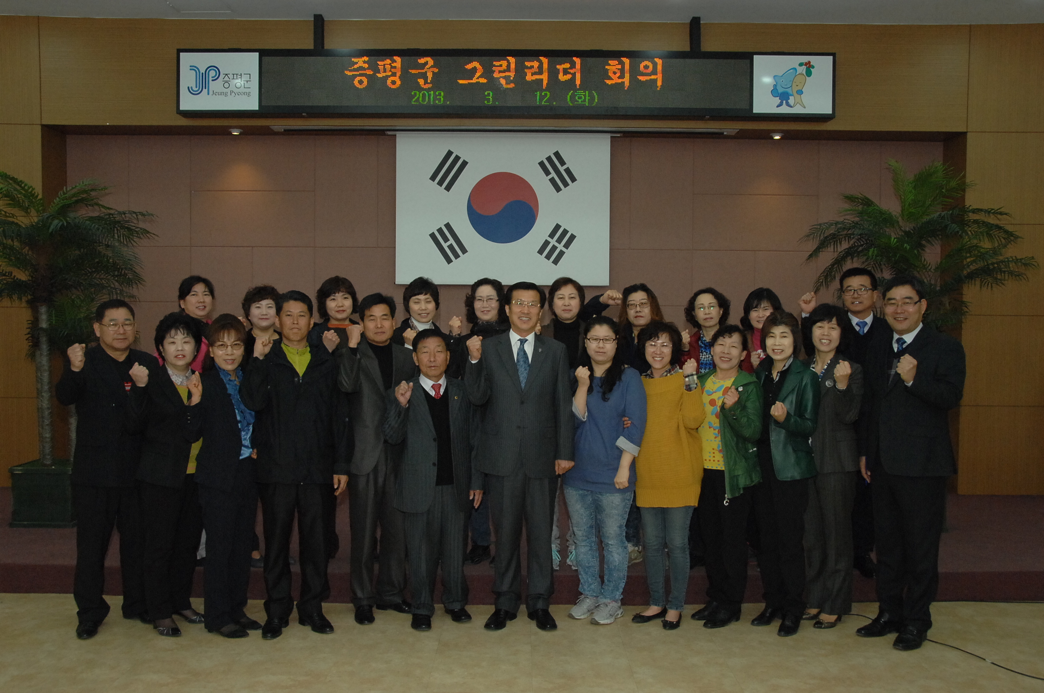 증평군은 12일 오전11시 군청 대회의실에서 홍성열 증평군수를 비롯해 그린리더협의체 9명, 주부그린리더 26명 및 군관계자 등 40여명이 참석한 가운데 녹색생활 실천습관과 녹색문화 조기정착을 위한 방안 마련을 위해 그린리더 회의를 개최 했다. [증평보도자료실 참조]