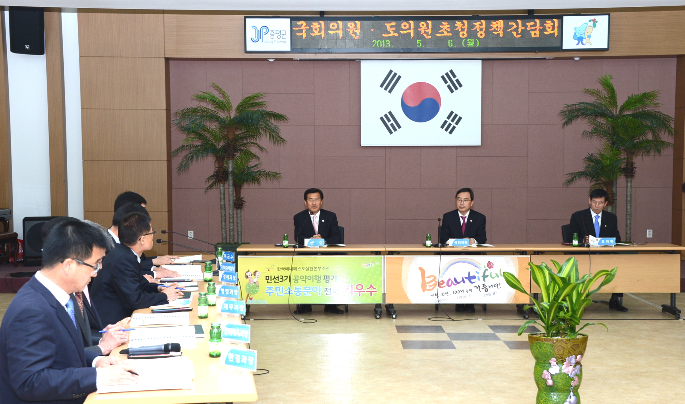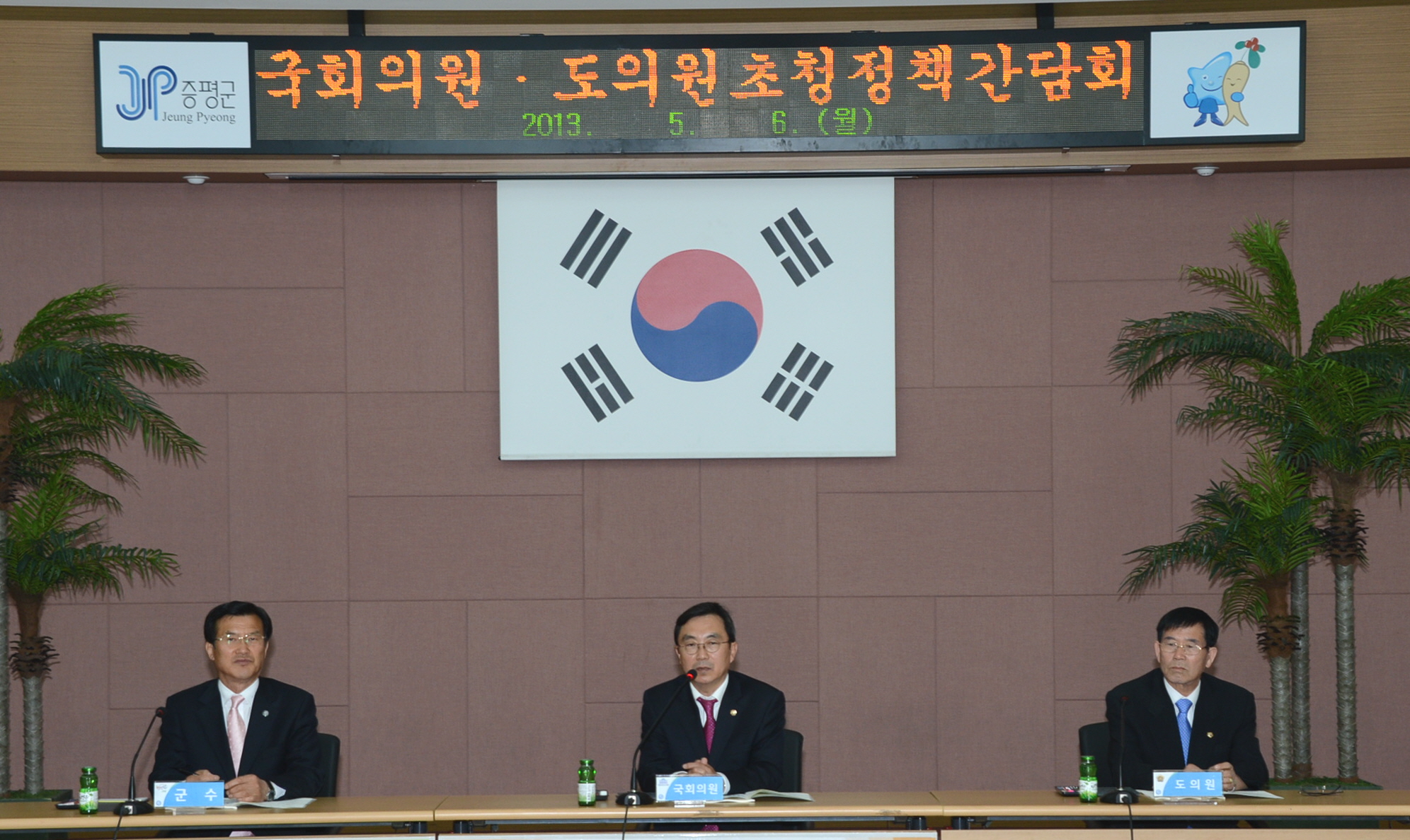 증평군은 6일 오전 군청 대회의실에서 경대수 국회의원과 김봉회 도의원을 초청해 지역현안 사업 설명과 군정 발전 방안 모색을 위한 정책간담회를 가졌다. [보도자료실 참조]