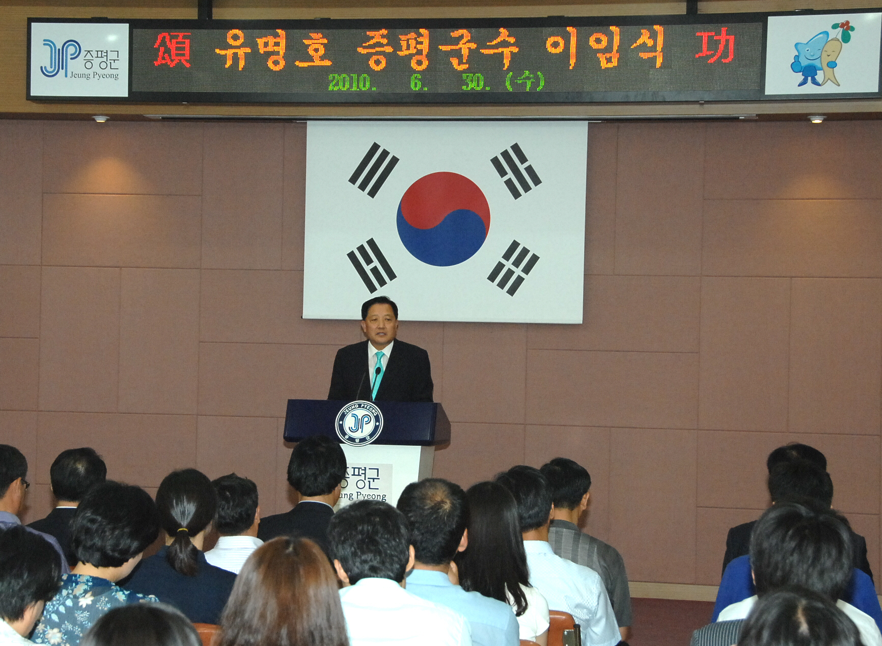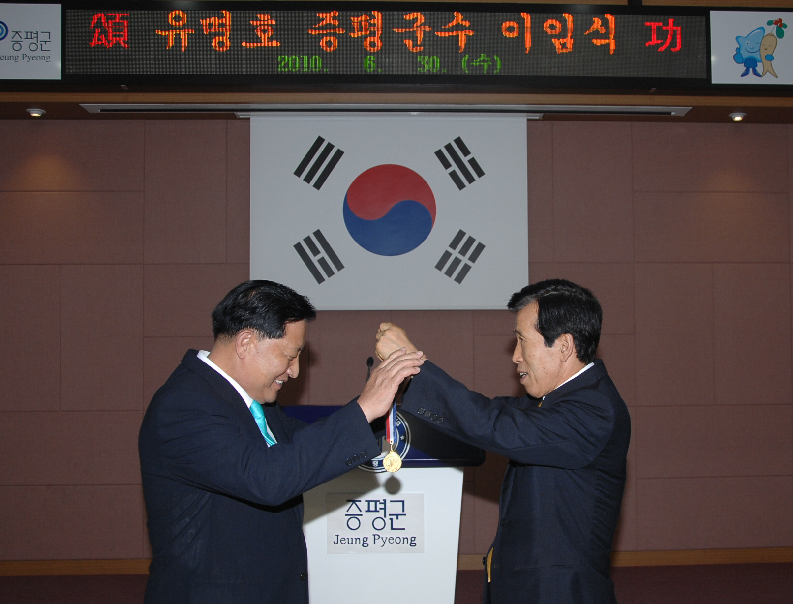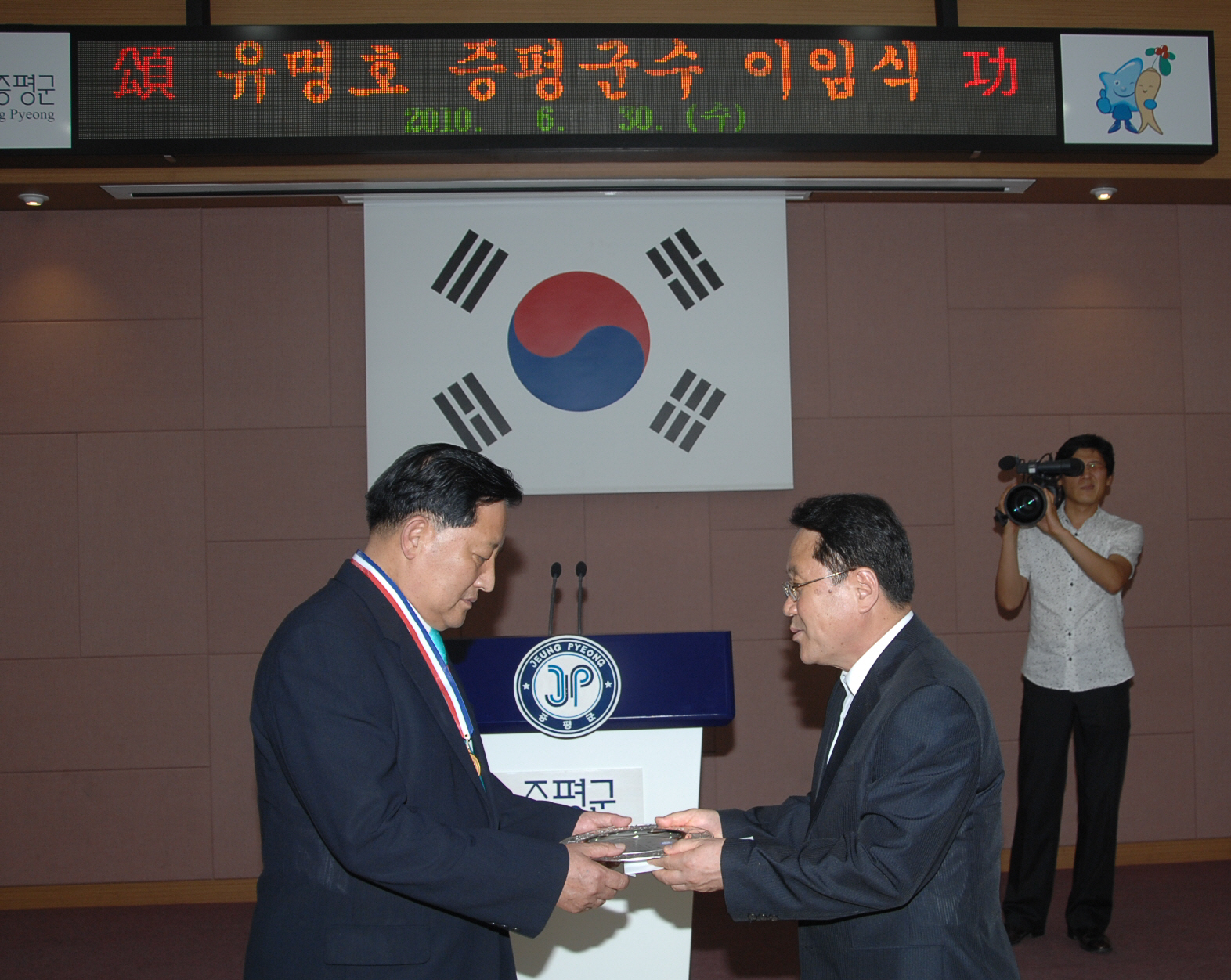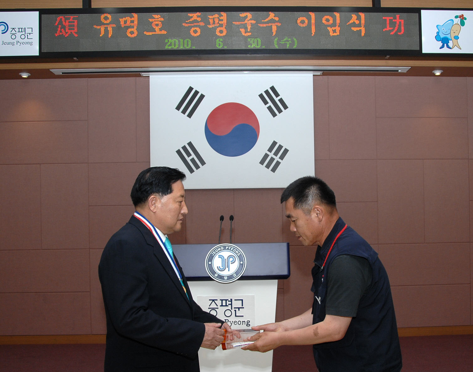 초대 및 2대 유명호 증평군수 이임식이 함께 일해 온 군 공무원들만이 참석한 가운데 30일 오후3시 군청 2층 대회의실에서 열렸다.[6월29일 보도자료 참조]