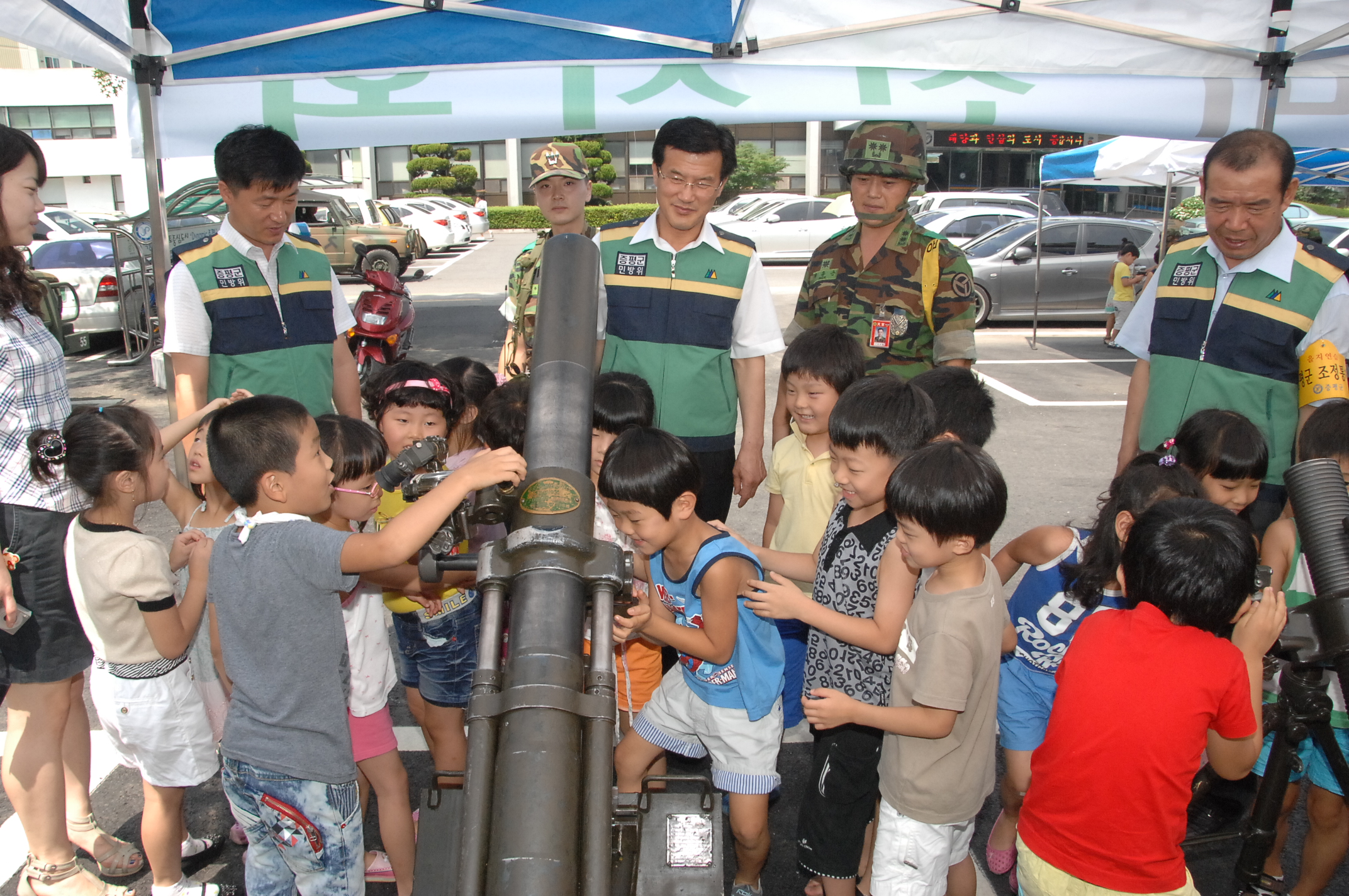 증평군은 37사단과 2161부대 2대대의 협조를 받아 17일 오전 10시부터 5시까지 군청 광장에서 을지훈련 장비 전시회가 열린 가운데 홍성열 군수가 동화나라 어린이 집 원생들과 장비를 관람하고 있다. [보도자료실 참조]